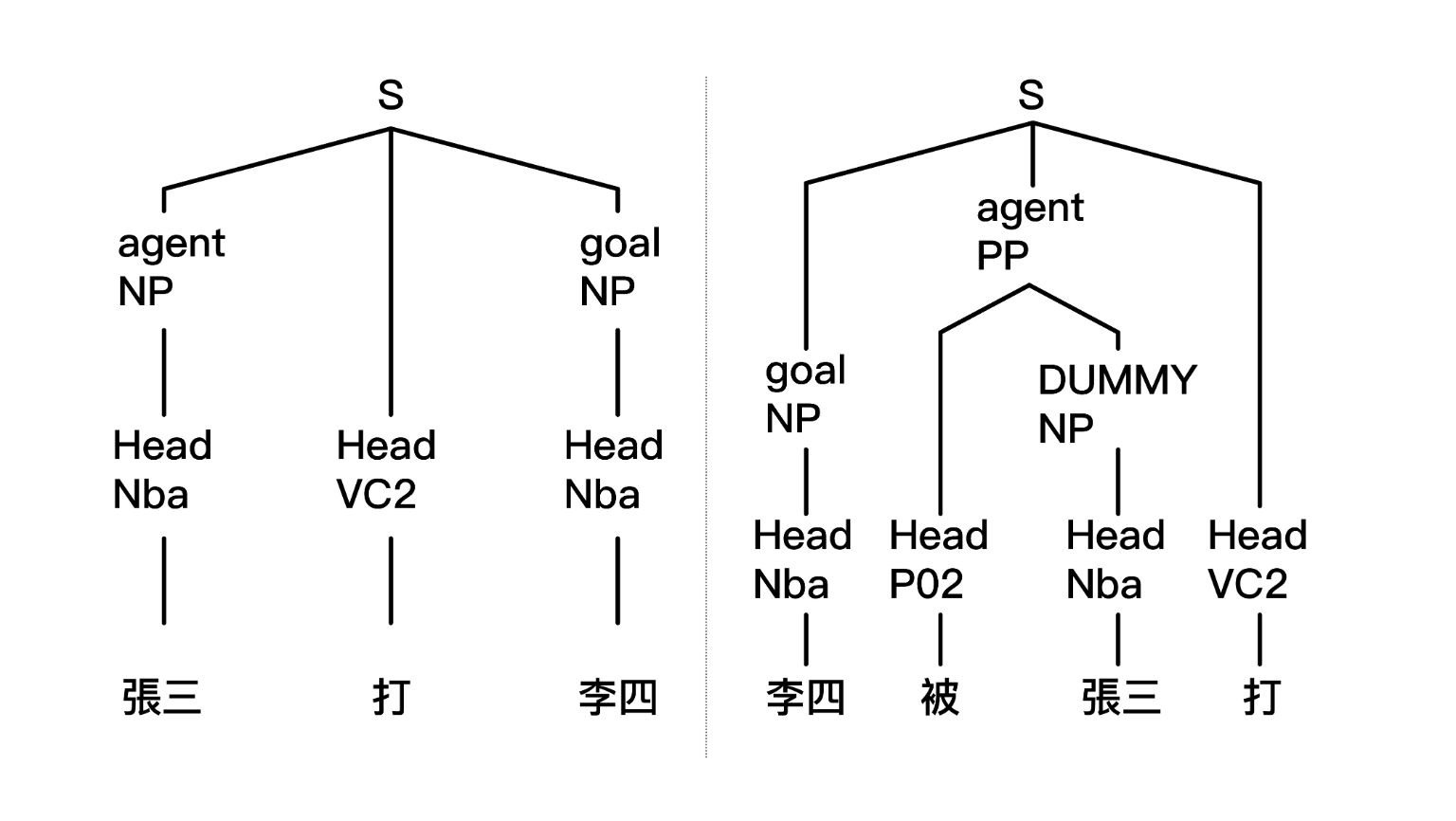 我們將每個詞彙集結成片語,再把每個片語標記上它所扮演的語義角色 (semantic role)。「張三」在兩個結構樹中都是「打」的發動者 (agent) 的角色,而「李四」都是「打」的對象 (goal) 的角色。如此一來,透過包含語義角色的結構樹,我們可以得知這兩個句子擁有相同的語義。