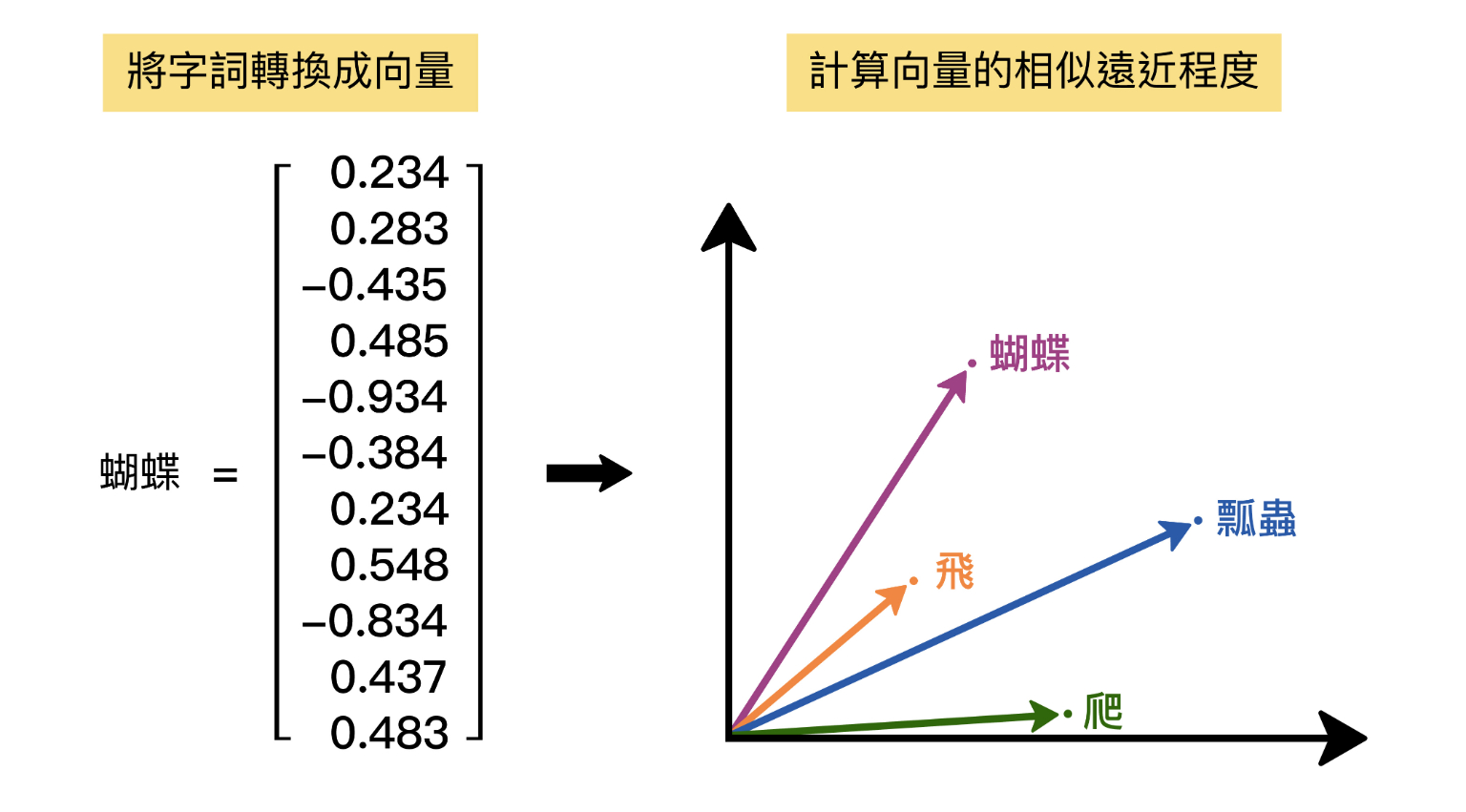 舉例來說,傳統的符號學中,「蝴蝶」、「瓢蟲」、「爬」是不同的三個詞彙。但改成用向量思考,「蝴蝶」和「瓢蟲」的向量距離就會比較近,「蝴蝶」和「爬」的向量距離就會比較遠,隨著訓練的文本越來越多,電腦可以自動調整各個詞彙的向量,解決訓練資料不足的問題,並提升電腦的抽象化思考。