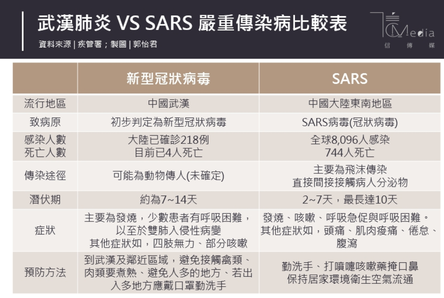 武漢肺炎出現時,曾被擔心是否是2002年由廣東開始爆發的SARS病毒再現。6種冠狀病毒裡其中兩種嚴重急性呼吸症候群(SARS)冠狀病毒和中東呼吸道症候群(MERS)冠狀病毒,會引起嚴重的呼吸系統疾病,甚至讓人喪失性命。