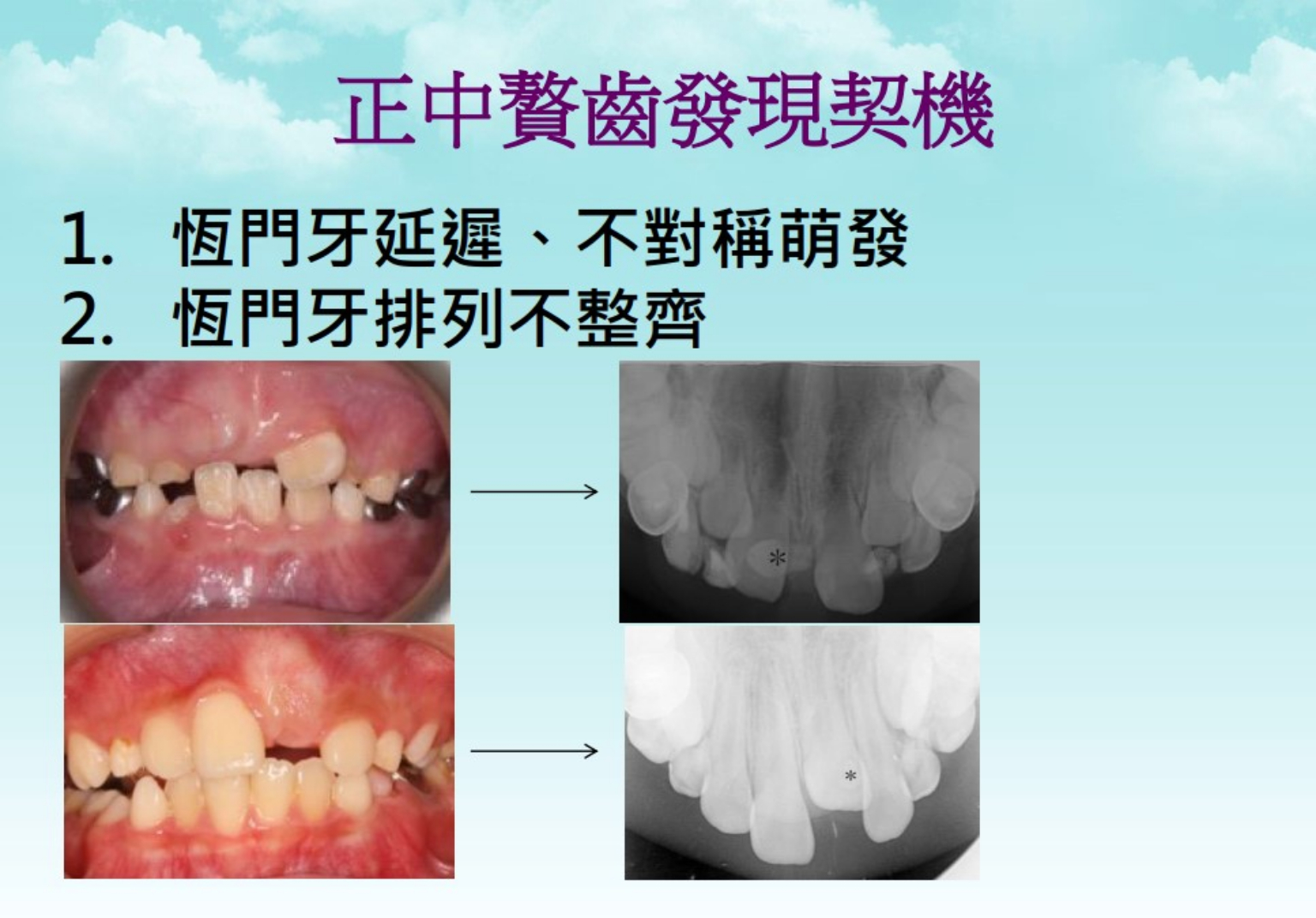 她進一步解釋,正中贅齒的形狀及生長方向多變,除了常會造成鄰近恆門齒的阻礙或異位萌發、旋轉、牙根吸收等外,本身也有囊性病變及長至鼻腔的可能。