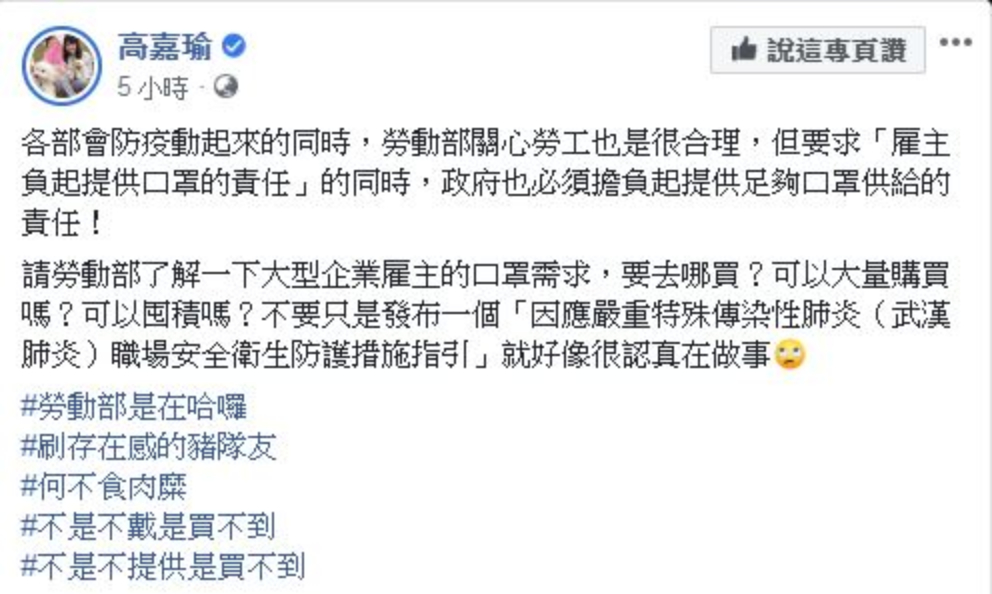 勞動部訂定的「因應嚴重特殊傳染性肺炎(武漢肺炎)職場安全衛生防護措施指引」,規定包含商場、交通站場等第一線服務人員的雇主,要負責提供口罩給員工,否則最高可處罰鍰30萬元。引來明天即將上任的新科立委高嘉瑜發文替他們陳情,很多人不是不戴口罩,是買不到,請勞動部先了解大型企業雇主的口罩需求,不要只是在刷存在感,「是在哈囉」?