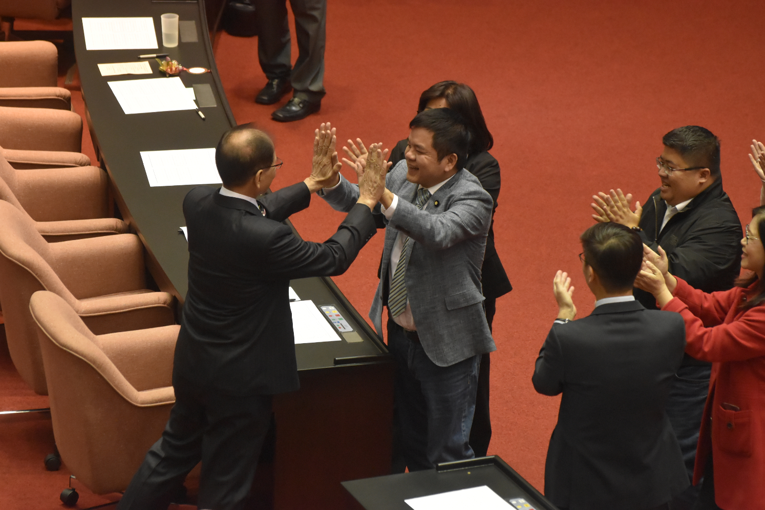 游錫堃確認當選後,與民進黨立委擊掌叫好。(攝影/趙世勳)