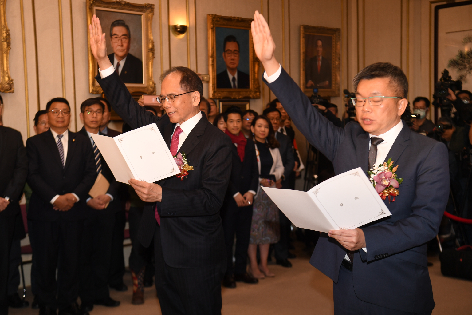 立法院新任院長游錫堃與副院長蔡其昌,於國父孫中山前宣誓就職。(圖片來源/中央社)