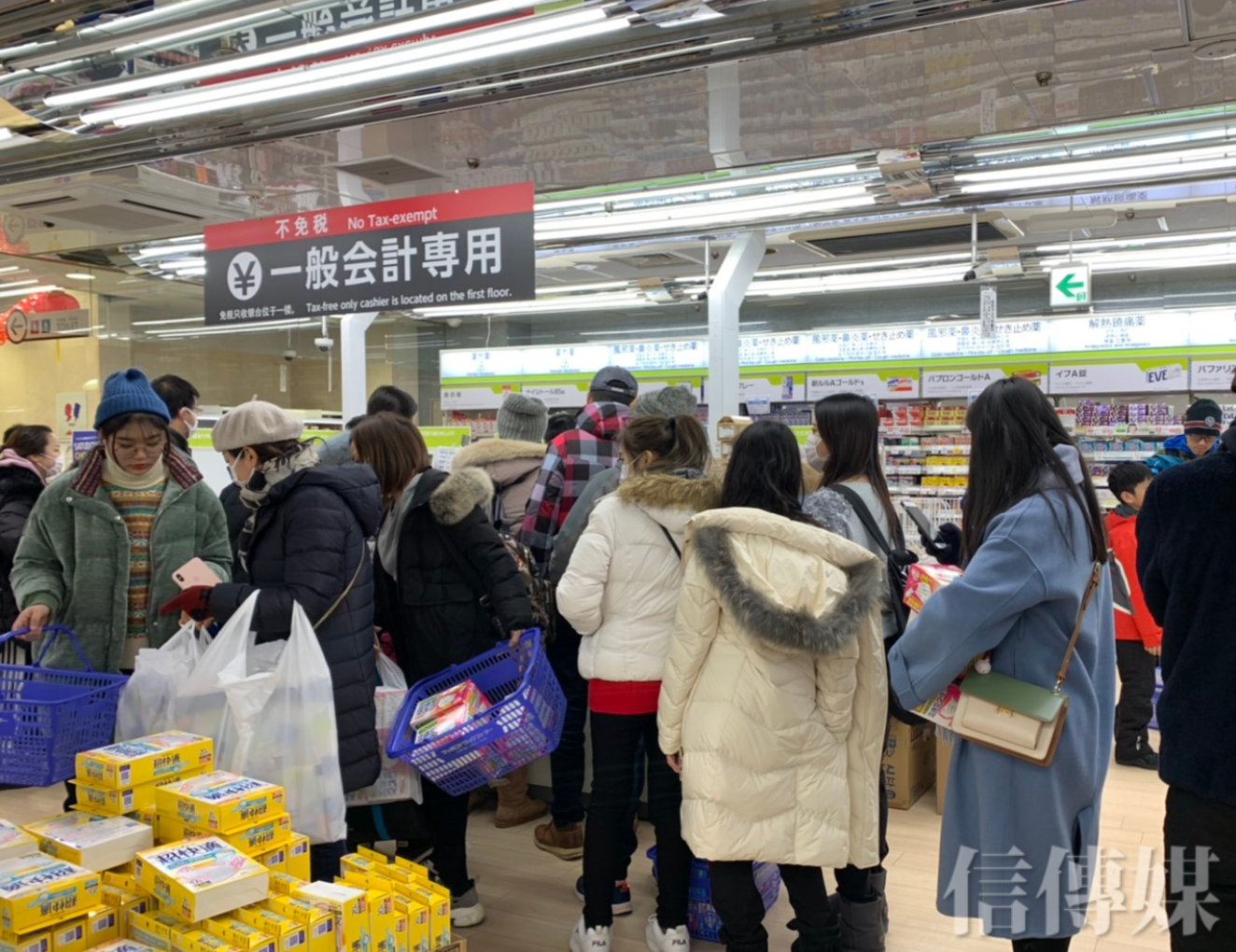 春節連假已過,但仍不少中國旅客在日本遊玩,《信傳媒》記者現場直擊,早上十點日本藥妝店一開門,一群中國大叔大媽馬上湧入搶口罩,雖然有每人限購三盒的規定,但走出店家的旅客都每個人都大包小包,想必有也許有人反覆排好幾次。不到十一點,當天送到的新貨口罩就賣光光。