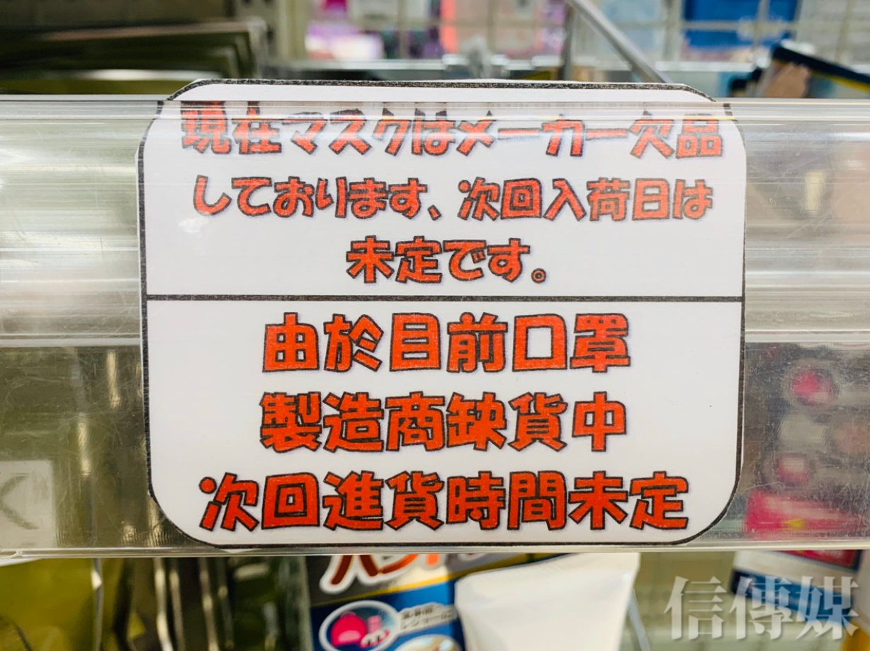 日本藥妝店口罩賣到缺貨,貼出告示牌表示進貨時間未定。