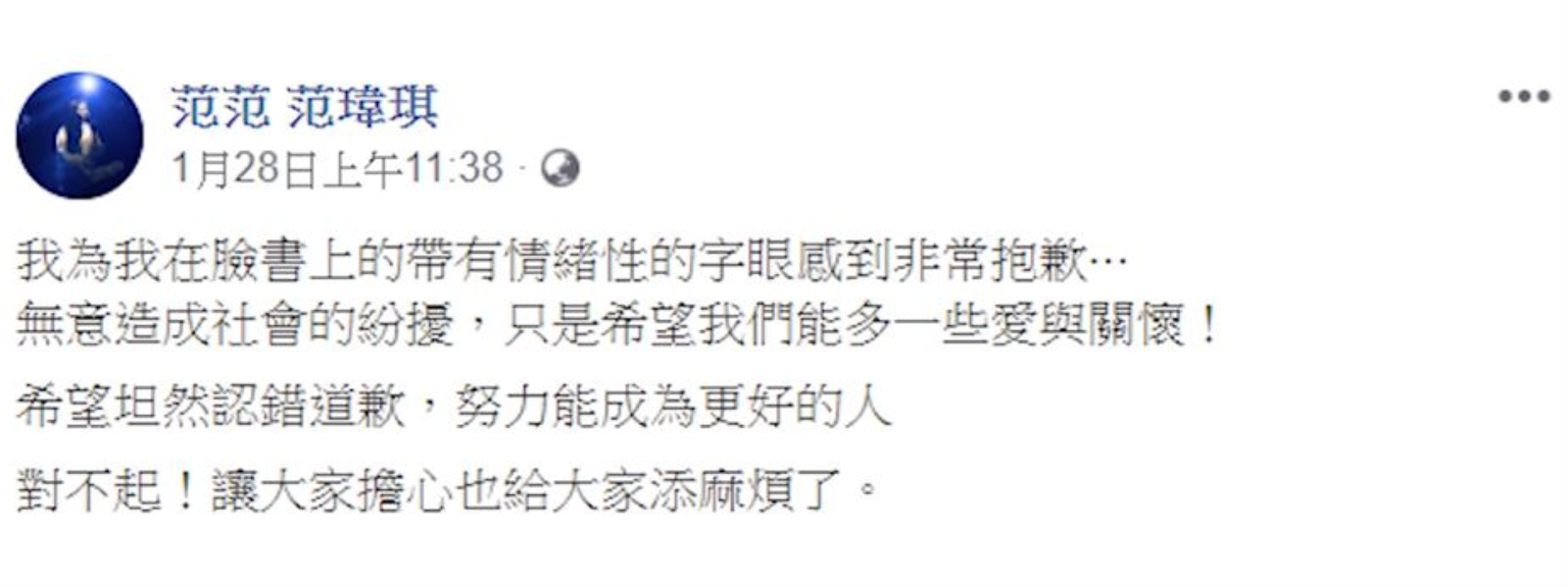 農曆春節前的1月24日,行政院長蘇貞昌下令口罩禁止出口一個月,27日范瑋琪於個人臉書飆罵行政院長狗官、臭流氓等等字眼,即時被截圖到PPT引發網友熱烈討論抨擊,她雖然馬上刪文並於隔日在粉專發表道歉聲明,但沒有平息眾議,反而讓網友憤怒值持續飆升。