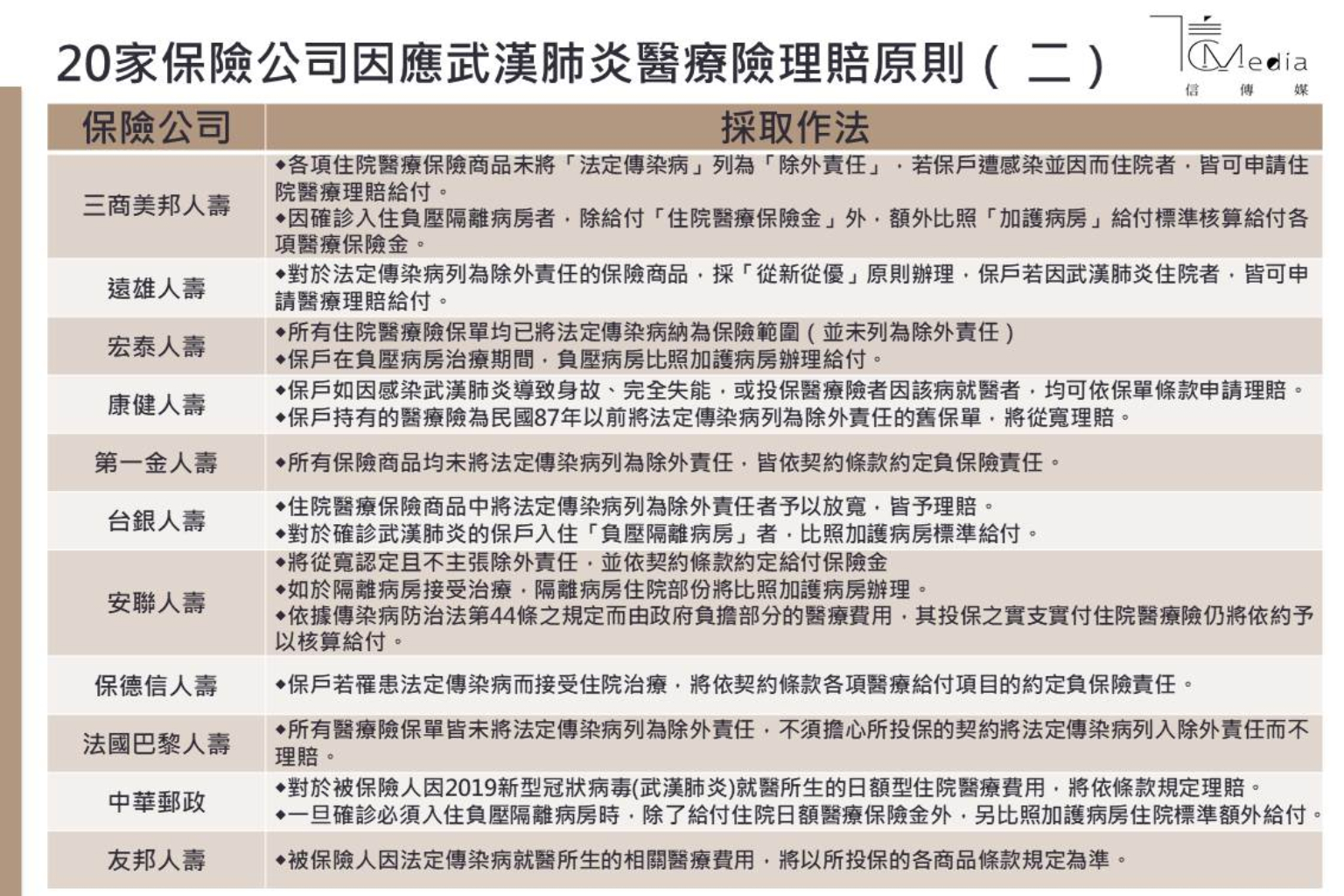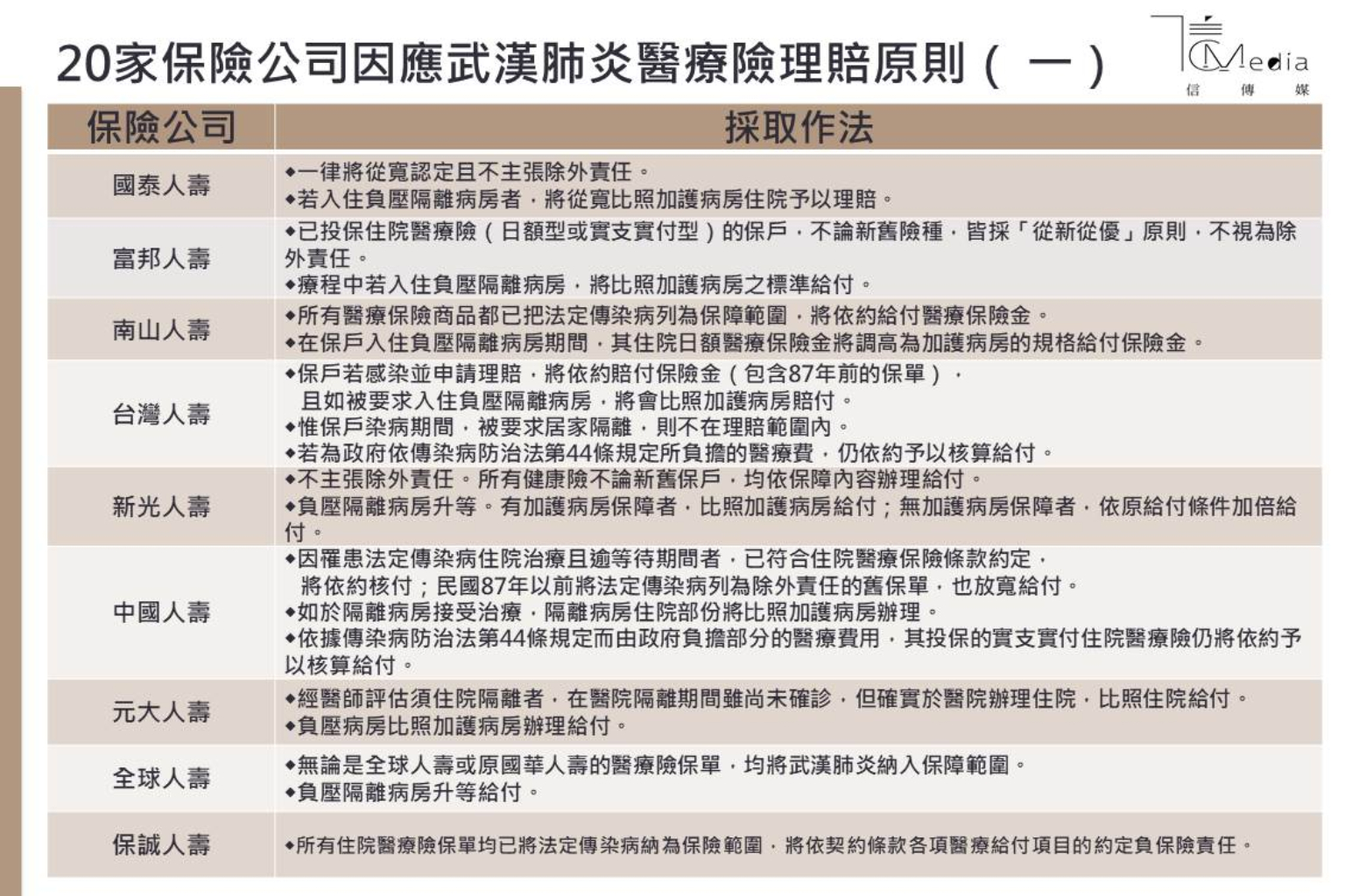 換句話說,若保戶因武漢肺炎就醫,其醫療費用依傳染病防治法第44條規定由政府所負擔時,台灣人壽、中國人壽、安聯人壽的保戶仍可以提出申請理賠,依條款約定給付保險金。