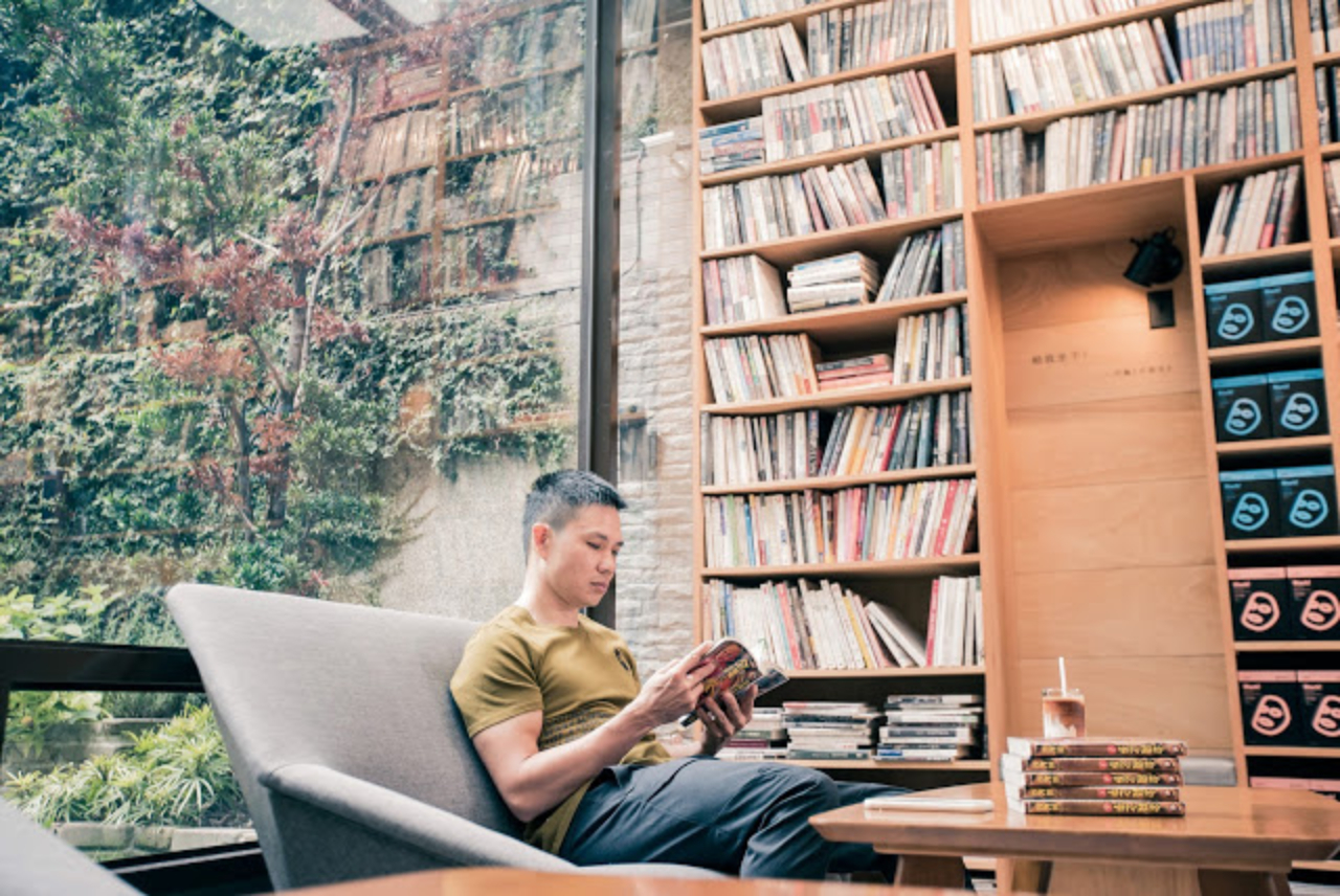 每周三為書店店休日,多虧了店休日讓平日繁忙的李昆霖能享受一人的圖書館,沉浸在閱讀氛圍裡。擁有四十年深厚閱讀功力,店內許多由他推薦的文字書籍陳列於架上,他隨手拿起桌上的漫畫聊起:「我最喜歡的漫畫是三田紀房的作品《金錢之拳》,故事在講一個拳擊手退役後的職涯,他開過燒烤店、賣過衣服,後來開始蓋工廠,最後甚至上市上櫃,這當中面臨過好幾次的危機,但這個拳擊手永不放棄,很多成功的人都有這樣的特質,這對做生意的人很重要。