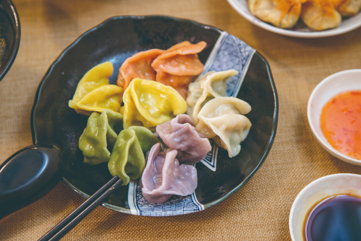 五色水餃一上桌,讓人食慾大開,也一併勾起好奇心。白色水餃分為高麗菜與韭菜口味,包入大溪在地的溫體黑豬肉;黃色水餃用紅蘿蔔汁製麵皮,內餡和著濃郁咖哩粉,並以洋蔥引出甜味;橘色水餃以番茄汁入麵皮,使用蟹肉絲打造海鮮風味;綠色水餃將菠菜汁拌進麵糰,營造田園口感;紫色水餃則是素食者最愛,山藥為麵皮基底,再將香菇、黑木耳、素肉條拌炒入餡,飽滿香氣纏繞舌尖。店家口味下足功夫,也重視包水餃的手法,雙手按壓讓空氣跑掉,餡料跟湯汁才能融合,並形成圓潤又飽滿的模樣,更為旅程增添喜氣。