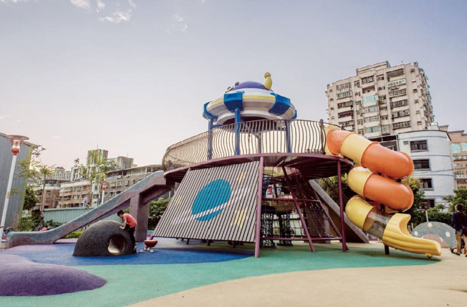 位於鄰里社區中的東昇公園腹地不大,但一踏進園內便會驚奇連連,以「星際探險」為主題,是全台首創的銀河系星球公園,以飛碟概念打造巨大遊樂設施,外觀鮮豔亮麗;溜滑梯底下的圓柱型雙層攀爬網讓孩子們可以由下往上爬行,從遠方看過去就像是被傳送至飛碟內,趣味十足。