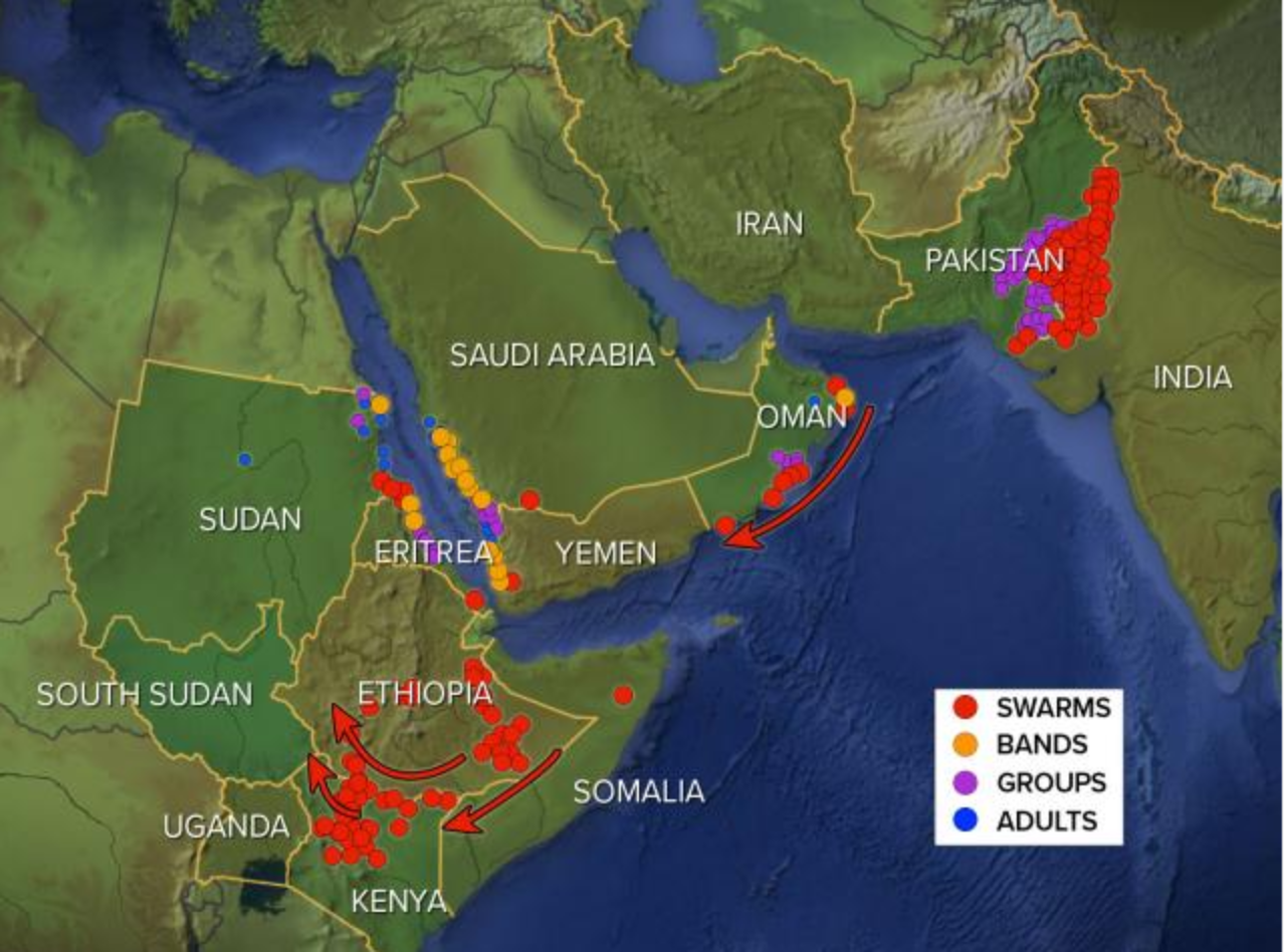 這4千億隻蝗蟲大軍是從哪裡來?主要成因為氣候變化。根據聯合國糧農組織(FAO)資料,這波非洲蝗災源於2018年夏季在阿拉伯海形成的颶風;在颶風侵襲沿岸國家後導致環境改變,使蝗群於2018年秋冬至2019年間逐漸在東非形成,