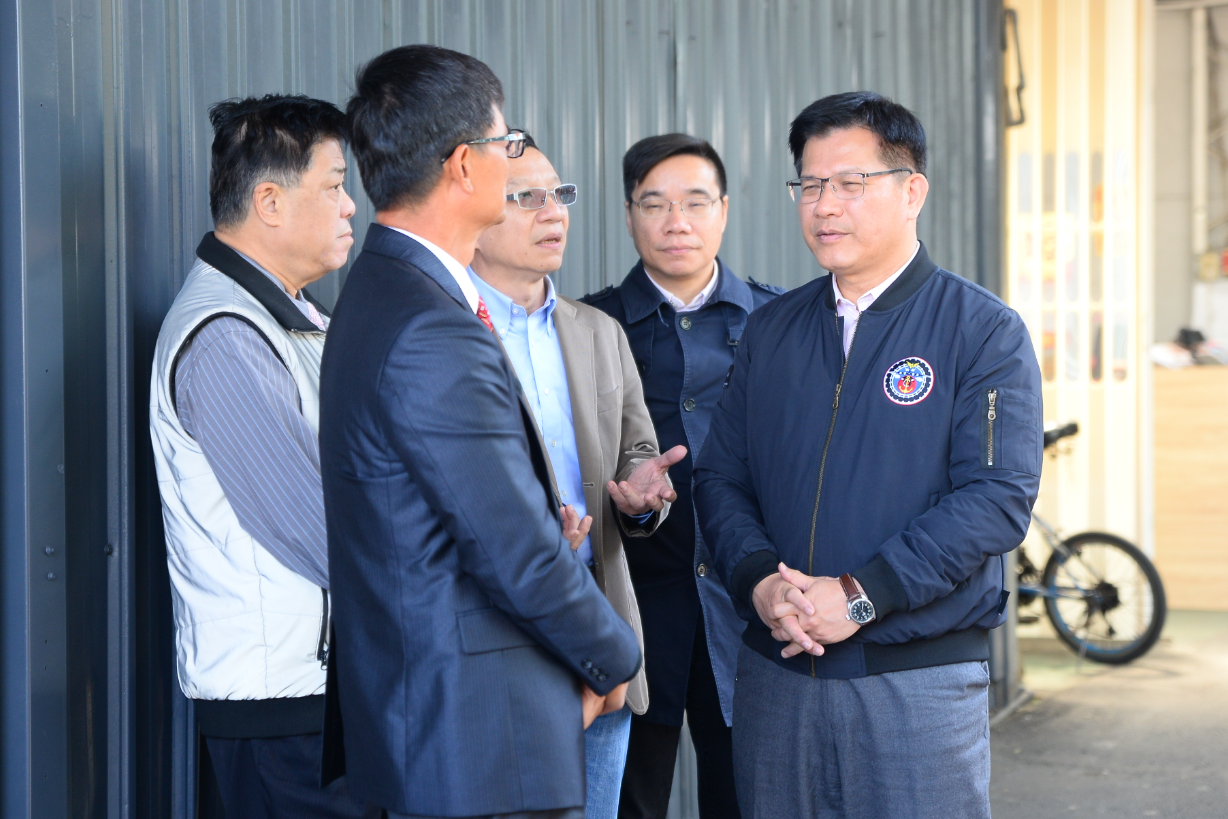 交通部長林佳龍今日至計程車隊訪視檢疫情形,一旁工作人員正在解說目前運作情況。(攝影/趙世勳)