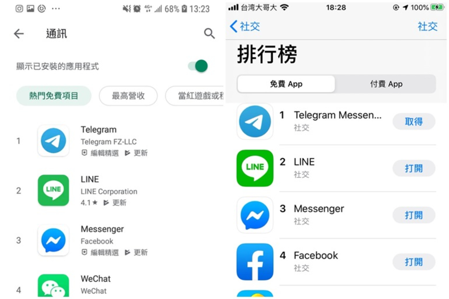 翻開Pay商店通訊中的免費熱門,會發現排名在LINE前面的是名為Telegram的軟體。根據數據統計公司《AppAnnie》的資料,台灣的Telegram下載量在 App Store、Google Play 上,在2月份為通訊軟體排行榜的幾乎都是第一名,僅有1到2天是LINE,新的通訊軟體趨勢似乎正逐漸成形。