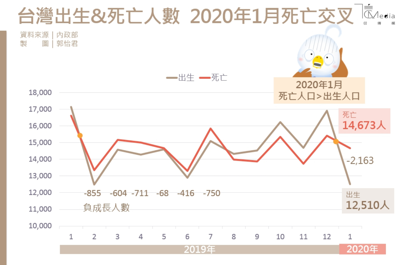 2020年1月再度出現死亡人數大於出生人數的死亡交叉。對照2019上半年2~7月也都呈現負成長,但其差距都沒有2020年1月相差2163人得多。