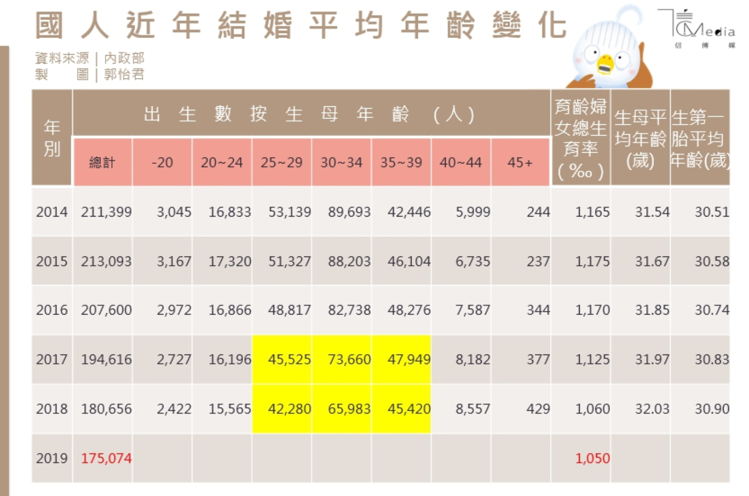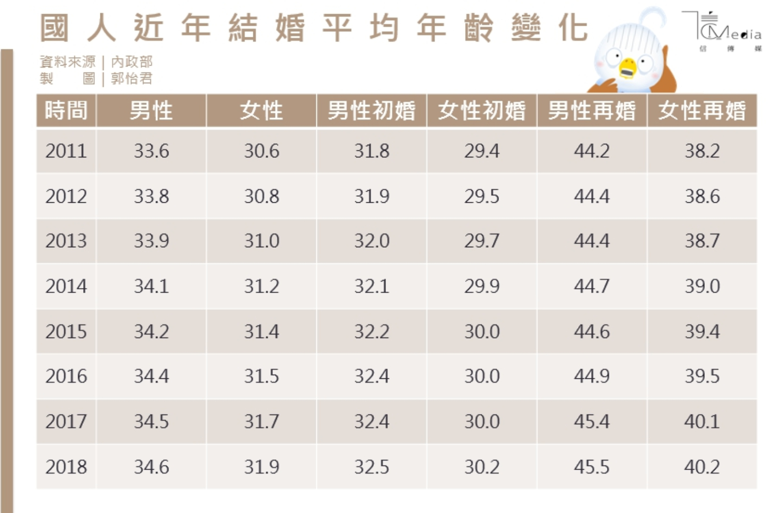 台灣不婚不生年輕人的比例持續上升,根據內政部統計,2018年男性平均結婚年齡為34.6歲、女性為31.9歲;男性初婚年齡為32.5歲、女性為30.2歲,皆突破30歲關卡。根據調查,已婚且生過孩子的女性當中,生第一胎年齡平均2006年為28.1歲、2011年為29.9歲、至2018年為30.9歲。