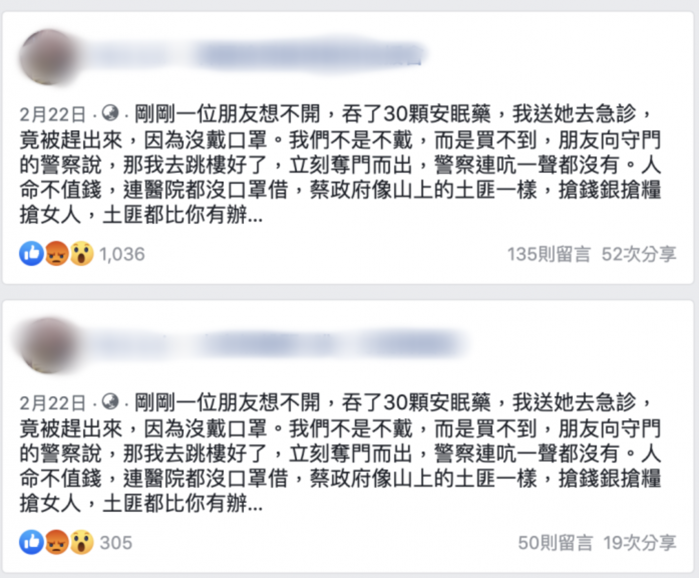 也有謠言宣稱,養蛙的親戚送貨至屏東體育館時,發現淪為臨時醫院,台灣南部已有700多例武漢肺炎確診案例;或是說高雄、台南等地,每天都運屍體去台中焚化等,也都被證實為假消息。甚至還流傳出,一位朋友吞了30顆安眠藥,送去急診卻因未戴口罩被警察趕出,說要去跳樓,遭質疑吞了30顆安眠藥竟然還能有意識。