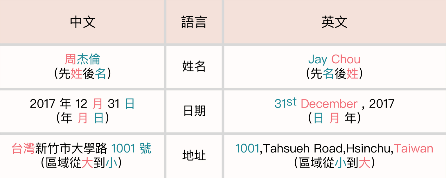這種基本「中心語在前」或是「中心語在後」的規則差異,就能夠用來解釋姓名、日期、和地址在中英文裡的相反順序了。