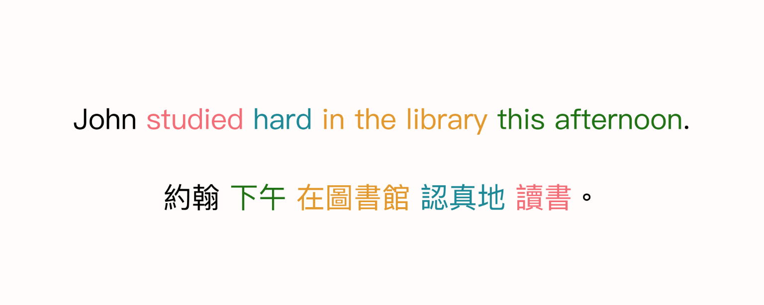 好玩的來了,英文句子中,動詞是領頭走在最前面,所有配角跟在後頭;而中文的句型,卻是先讓配角們出場,核心的動詞在最後壓軸。