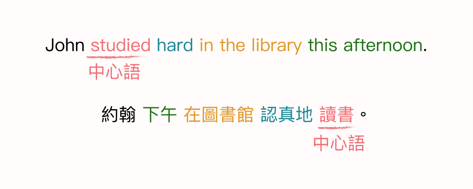 林若望繼續用前面的句子為例,「讀書 / study」就是核心劇本 ( 動詞 ),「約翰 / John」是主角,其他用來補充動詞的就是配角 ( 修飾語 ),跟動詞配在一起形成「動詞片語」。