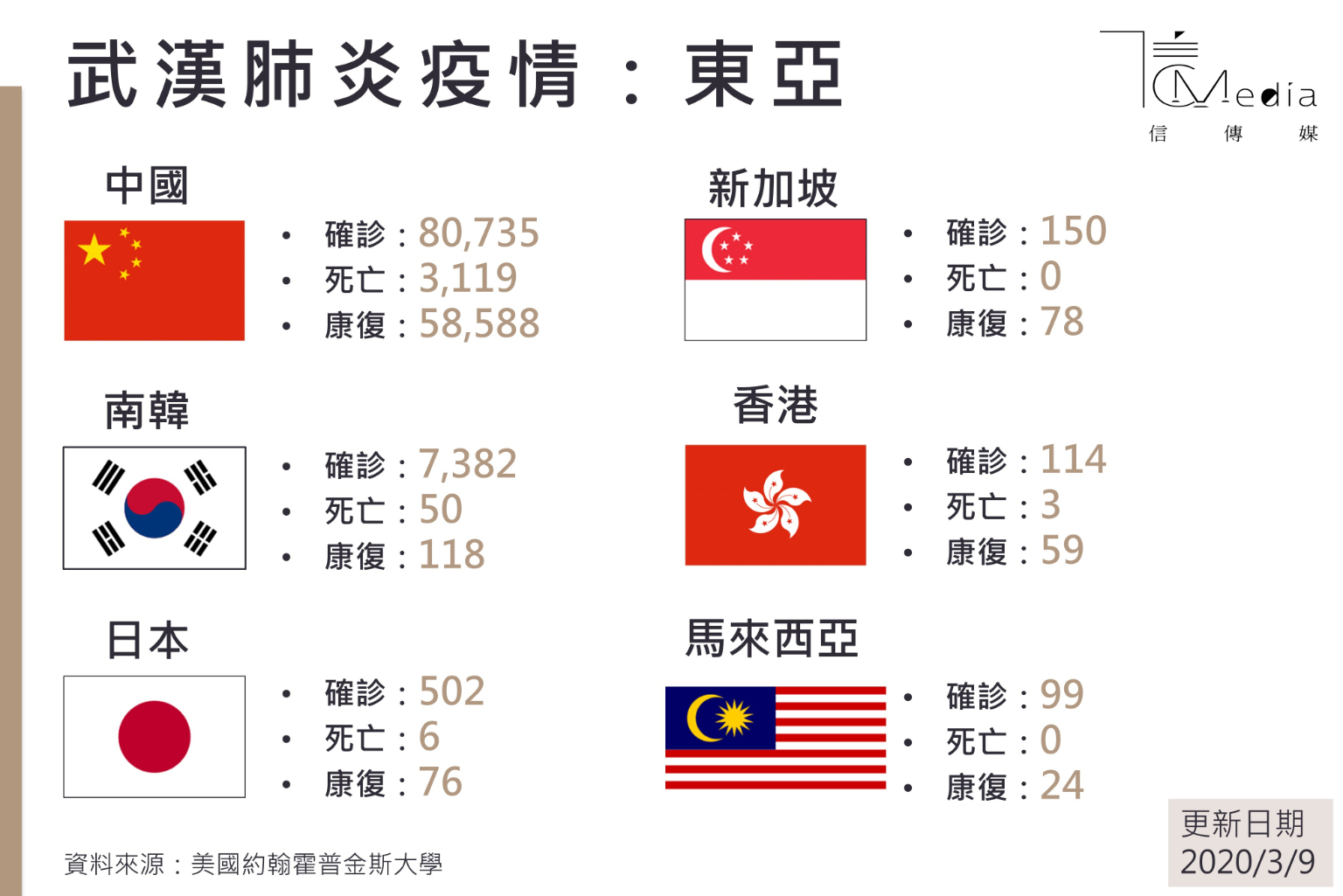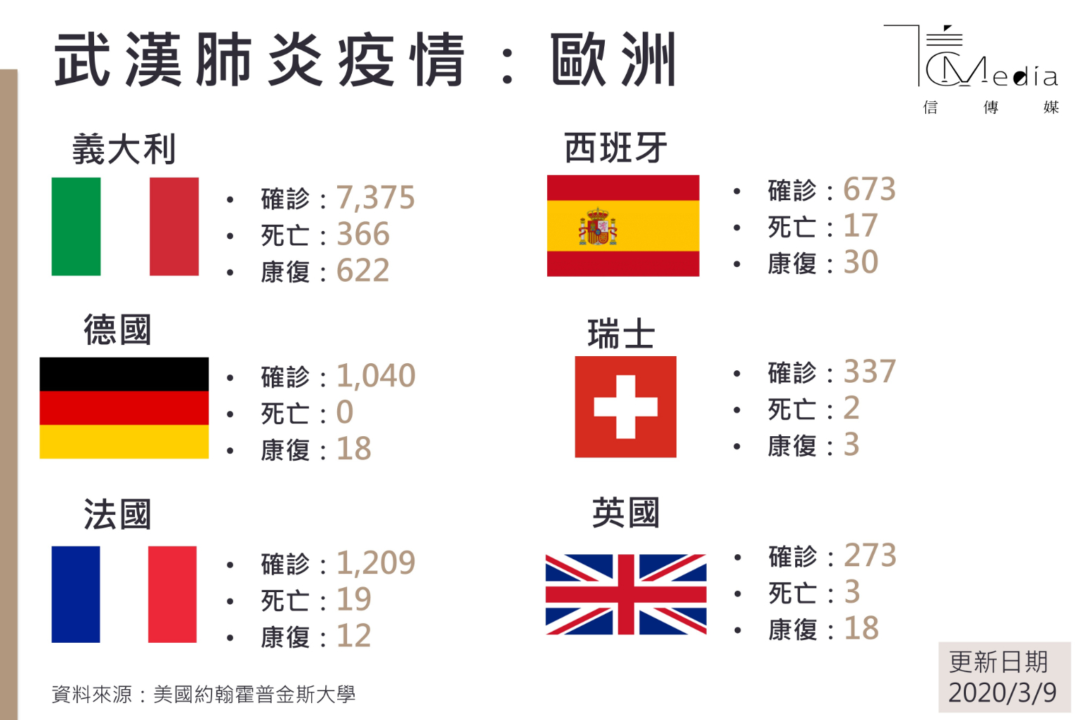 義大利的死亡率目前高達4.96%,為全球最高。而南韓9日也新增1例死亡個案,並新增248例確診,累積已達7382人染疫。