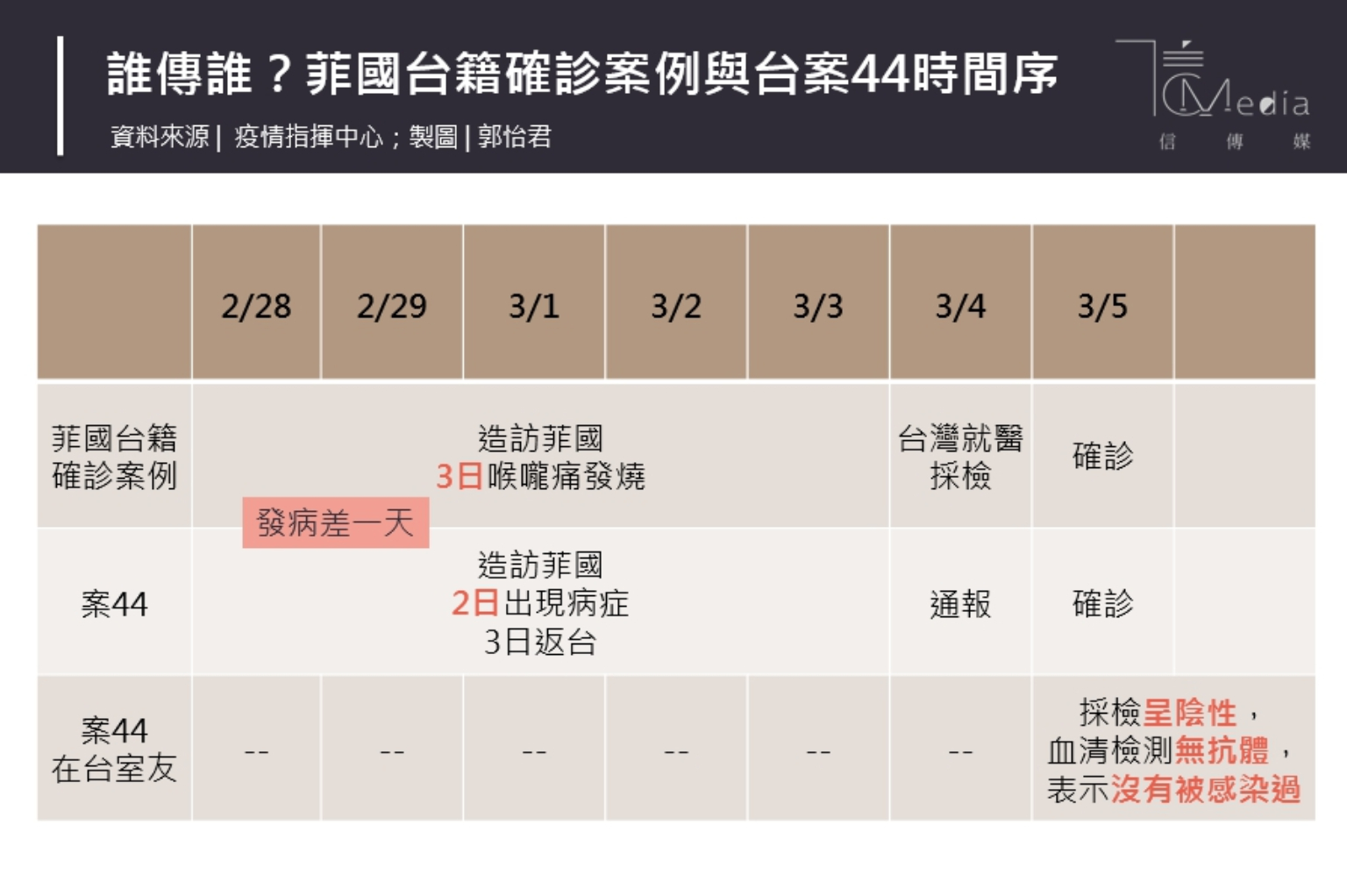 中央疫情指揮中心監測應變官莊人祥表示,台灣的第44例,是於2月28日至3月3日前往菲律賓旅遊,3月2日在菲律賓期間發病,3月5日確診;而其在菲律賓的台籍友人是在3月3日發病,3月6日就醫採檢,3月8日在當地確診,第44例雖是所謂的「指標病例」,但是否為感染源仍有待釐清。