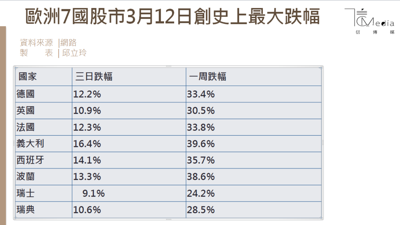 疫情爆發更嚴重的歐洲,其股市周四跌得比美國還慘,英國、法國分別大跌10.9%、12.3%,德國股市重挫12.2%創4年多新低;義大利和西班牙股市分別狂跌16.4%和14%。