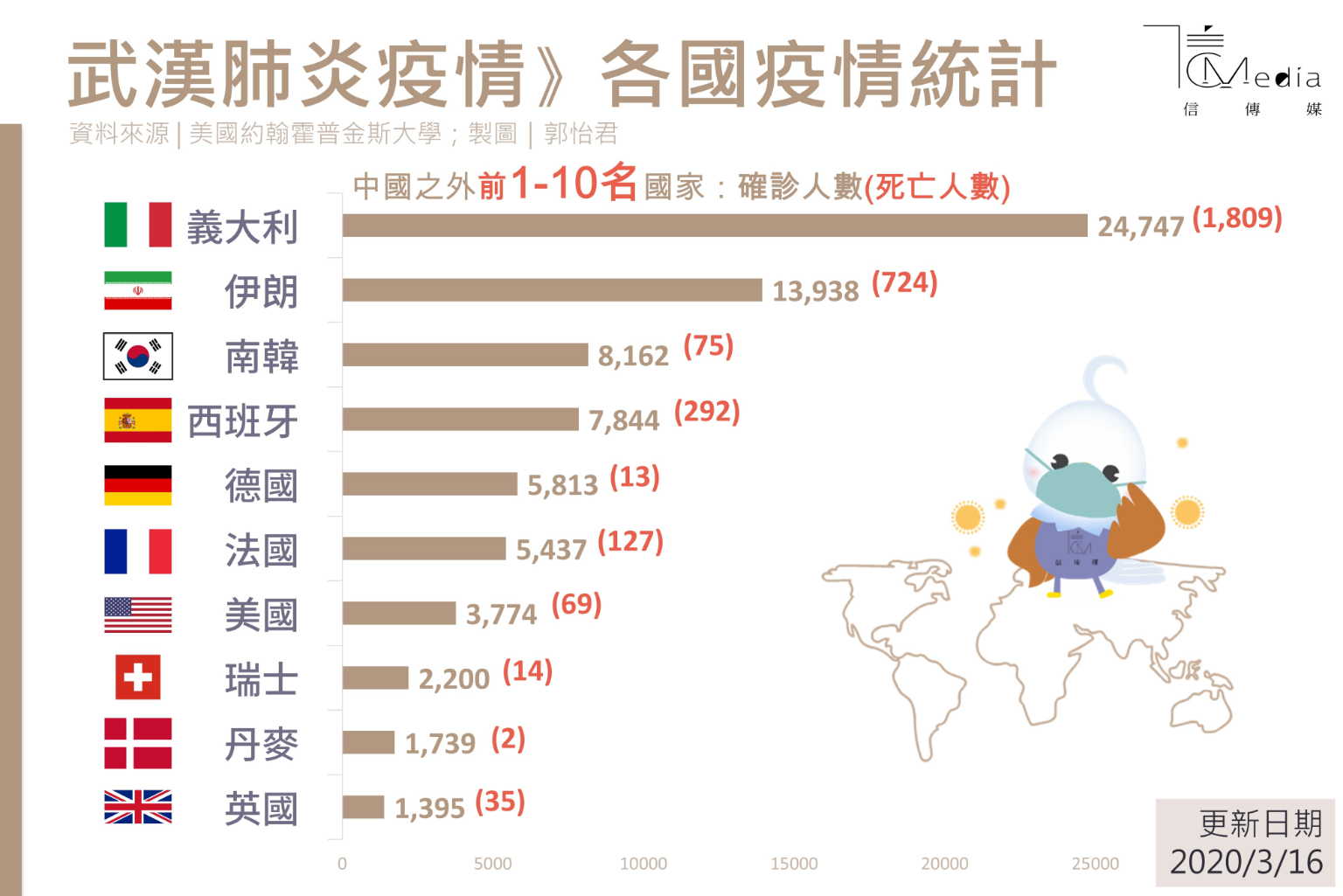 現在歐美成為重災區,這次歐陸的義大利疫情失控是主要原因。歐洲為什麼最慘重?2月21日義大利其實只有9個確診病例,沒有人死亡,到今(3月16日)天已經上升到24747確診,1809人死亡,其他國家也都大幅增加。