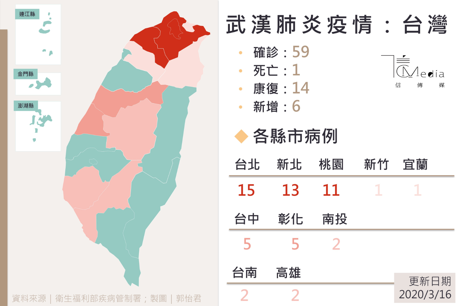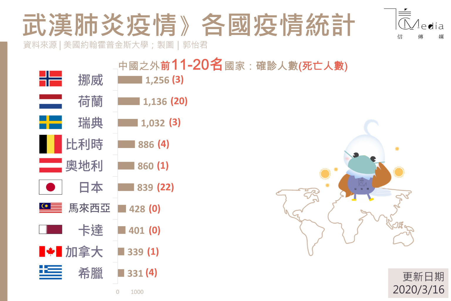從3月16日全球累積的確診病例到達169387例,造成6513人死亡,這其中,中國確診81020例,3217人死亡,如果扣除中國,中國以外的地區確診病例88367例,3296人死亡,顯然中國以外地區,不管確診病例及死亡人數都首度超過中國本土,這是中國與非中國以外疫情的首度「黃金交叉」,後續變化值得觀察。