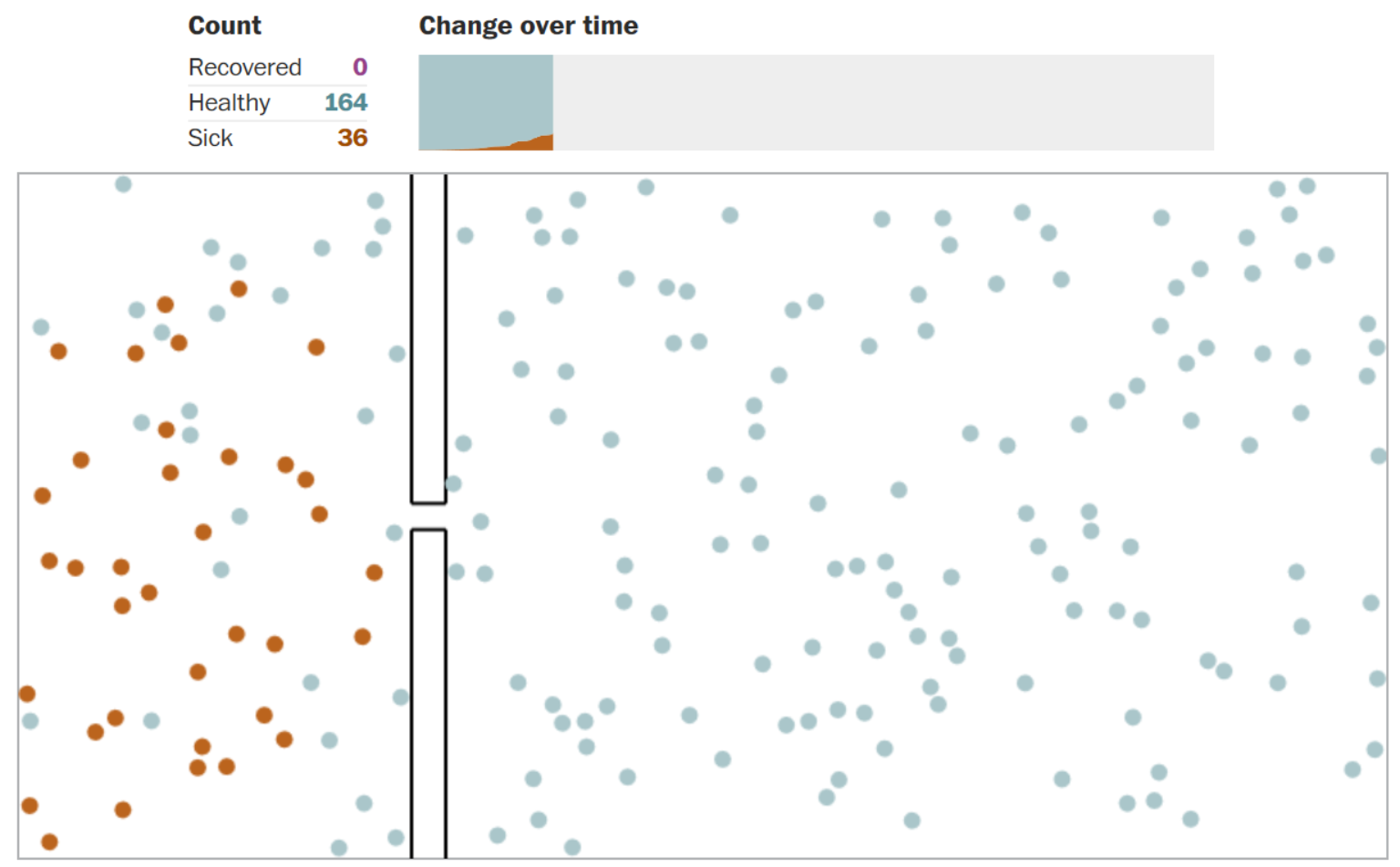 《華盛頓郵報》製圖記者史蒂文斯(Harry Stevens)製作了一個「武漢肺炎模擬器」,模擬其在人群中的散播過程,並解釋何以它爆發後會先以指數成長,然後逐漸趨緩。