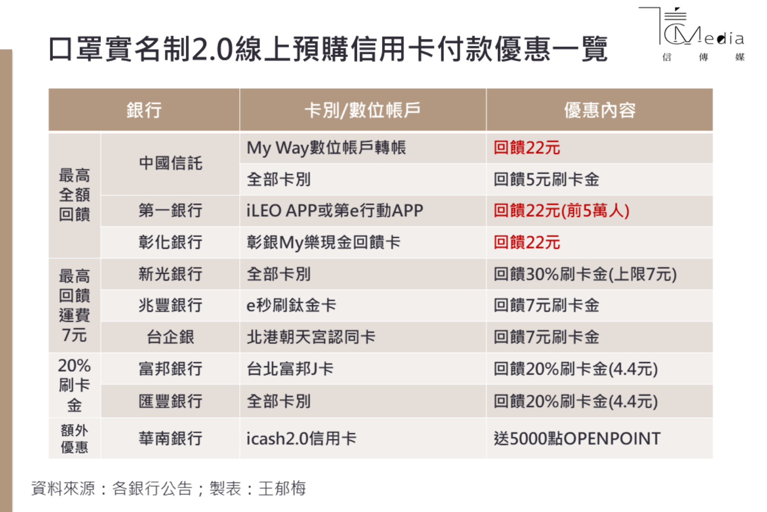 信用卡優惠方面,由下圖可以看到,最大方為中信、一銀與彰銀,主打最高可「全額」回饋,強調積極配合政府政策,落實社會責任,陪伴民眾度過疫情難關,更重要的是希望透過口罩網購,串起更多刷卡商機,提高卡片使用率,以及數位帳戶的佔有率。
