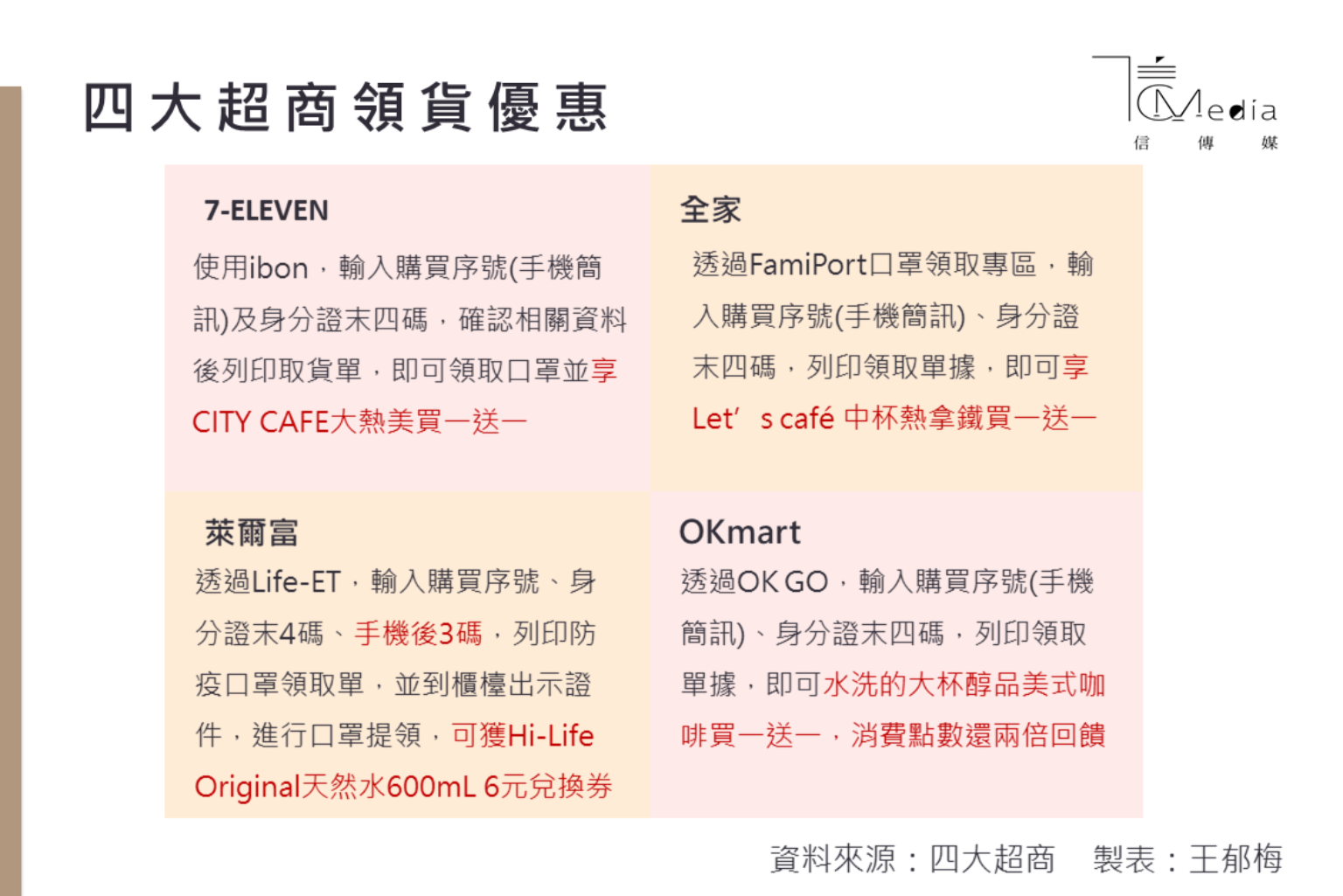 口罩實名制2.0全台4大超商加起來超過1萬間超商可提供取貨,3月26日至4月1日的第一波口罩取貨期間,分別推出各式優惠,鼓勵民眾透過網路購買後至超商取貨,畢竟「人進來」就能增加「貨出去」的機會,其中如下圖,7-ELEVEN、全家、OKmart三者看準了會使用線上預購的多是沒有時間排隊的上班族,因此祭出咖啡買一送一的促銷優惠。