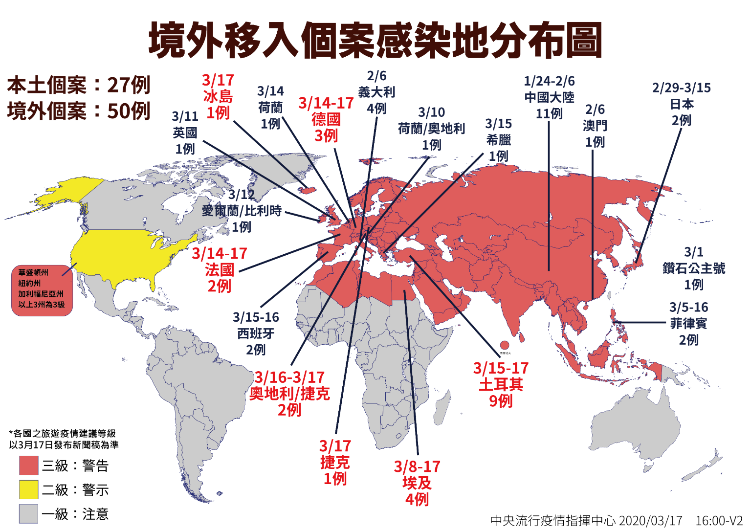 基於國人至當地有感染風險,陳時中也在今天記者會中宣布,除已公布列第3級之中國大陸(含港澳)、韓國及中亞國家,自3月19日零時起並將下列亞洲19國、東歐1國及美國3州之旅遊疫情建議提升至第三級警告(Warning):