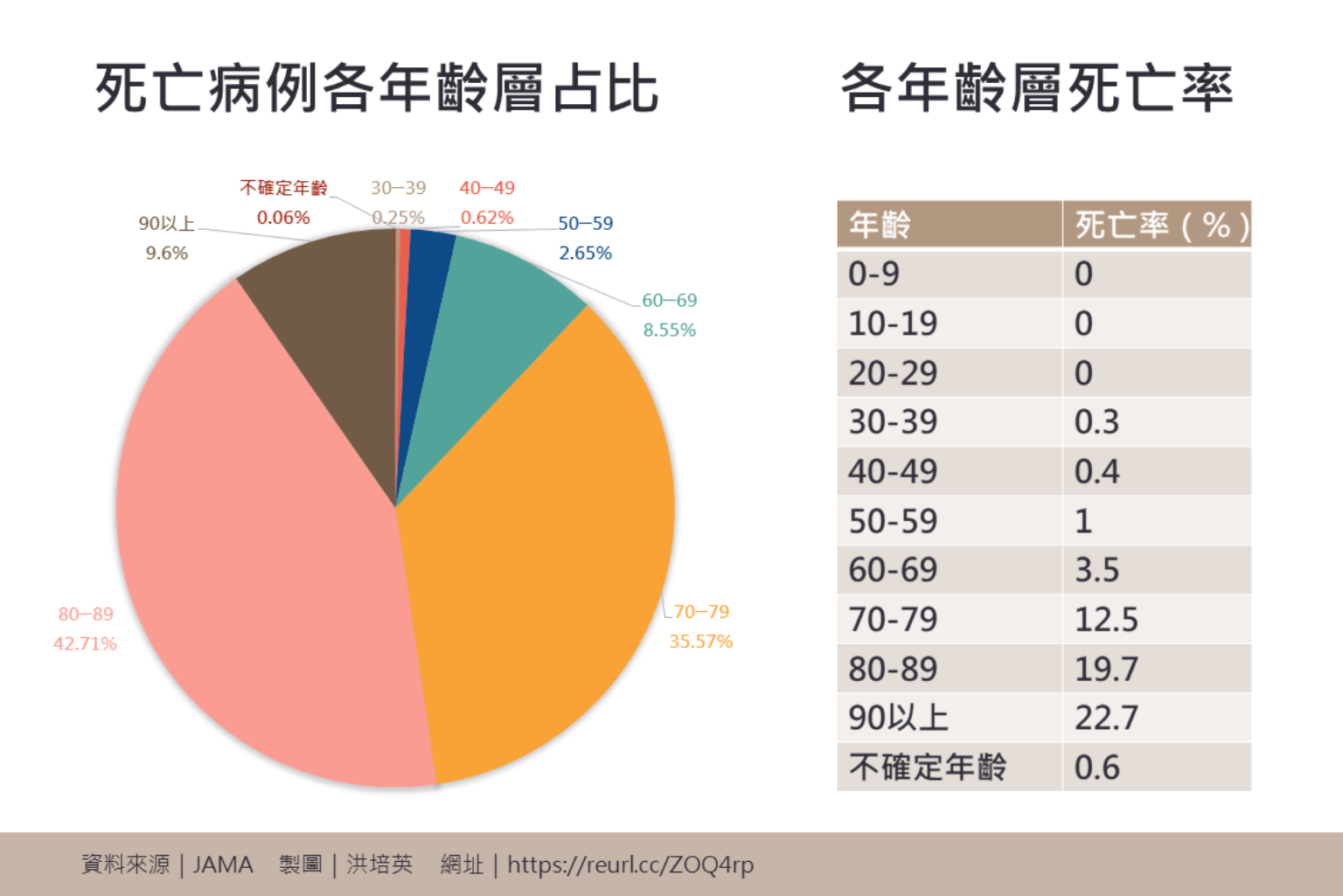 3月17日美國醫學權威期刊JAMA刊出一系列圖表,指出義大利死亡病例中,60歲以上患者高佔96%,29歲以下患者為0%,而且死亡率隨年齡漸長而增加。