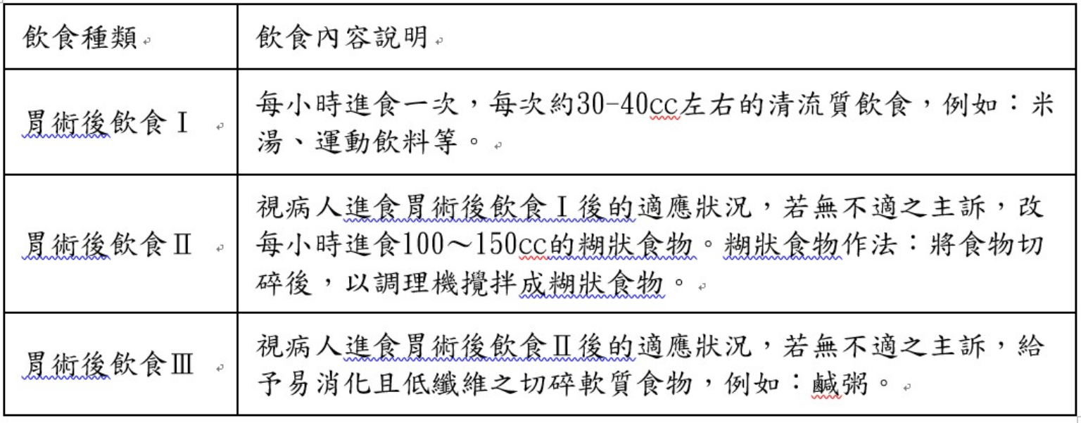 3.飲食攝取量應採少量多餐,然後逐漸增加量(手術後早期的攝取量建議如表一)