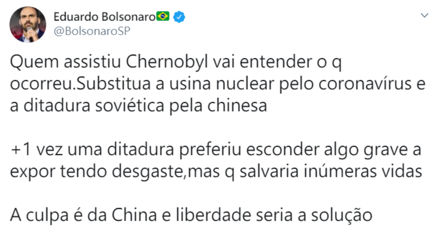 巴西總統波索納洛(Jair Bolsonaro)之子,眾議員愛德華多(Eduardo Bolsonaro)18日在推特上說,「有看《核爆家園》(Chernobyl)的人就知道發生了什麼事。把核能電廠換成新冠肺炎,把蘇聯獨裁政權換成中國(就對了)」。