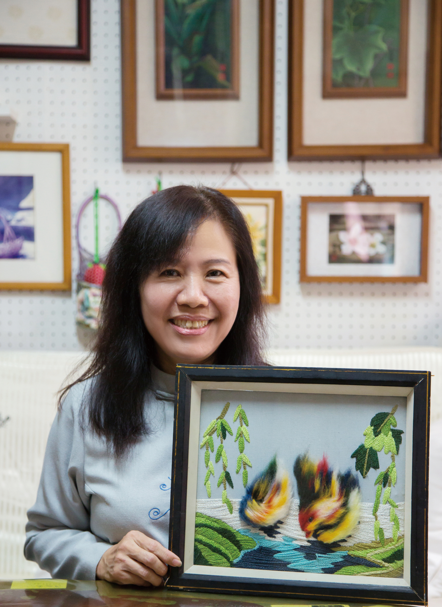 至於問到繡畫時,如何獲得創作靈感?范鳳琴毫不遲疑的說,定居在桃園後,生活周遭都是她繡畫的題材來源,「像是那幅就是我去觀音區看到的蓮花,這幅是巷口牆角開的酢漿草。」聊起掛在客廳一幅幅的作品,范鳳琴如數家珍。