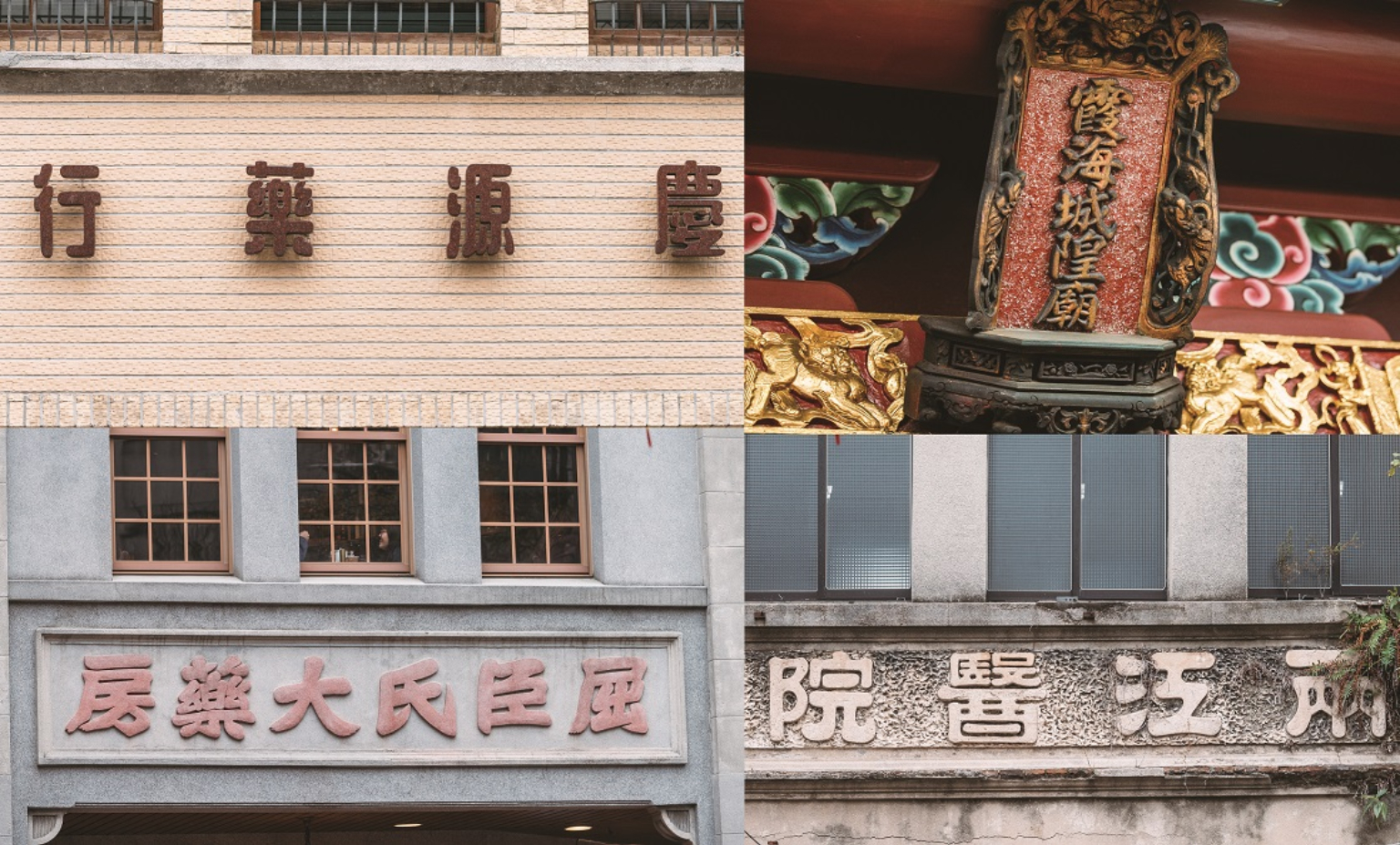 同一條街上的「慶源藥行」,帶有20 世紀早期圓體的美術字風格,縮小字面、調整筆鋒,看來舒服、和緩,是醫療院所在招牌擇字上的小技巧。同樣是醫療院所,迪化街的「屈臣氏大藥房」選字不同於香港屈臣氏標準的稜角分明魏碑筆畫,改以圓潤溫柔的魏碑體書寫,保有楷書的韻味,同時帶有台灣特有的和氣圓融性格。