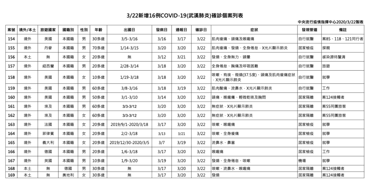 案161及162為埃及旅遊團團員,原列為接觸者之新增個案,居家隔離期間於3月20日發病,經安排就醫及採檢通報,於今日確診。該旅遊團群聚截至目前共9人確診(8名團員、1名接觸者)。
