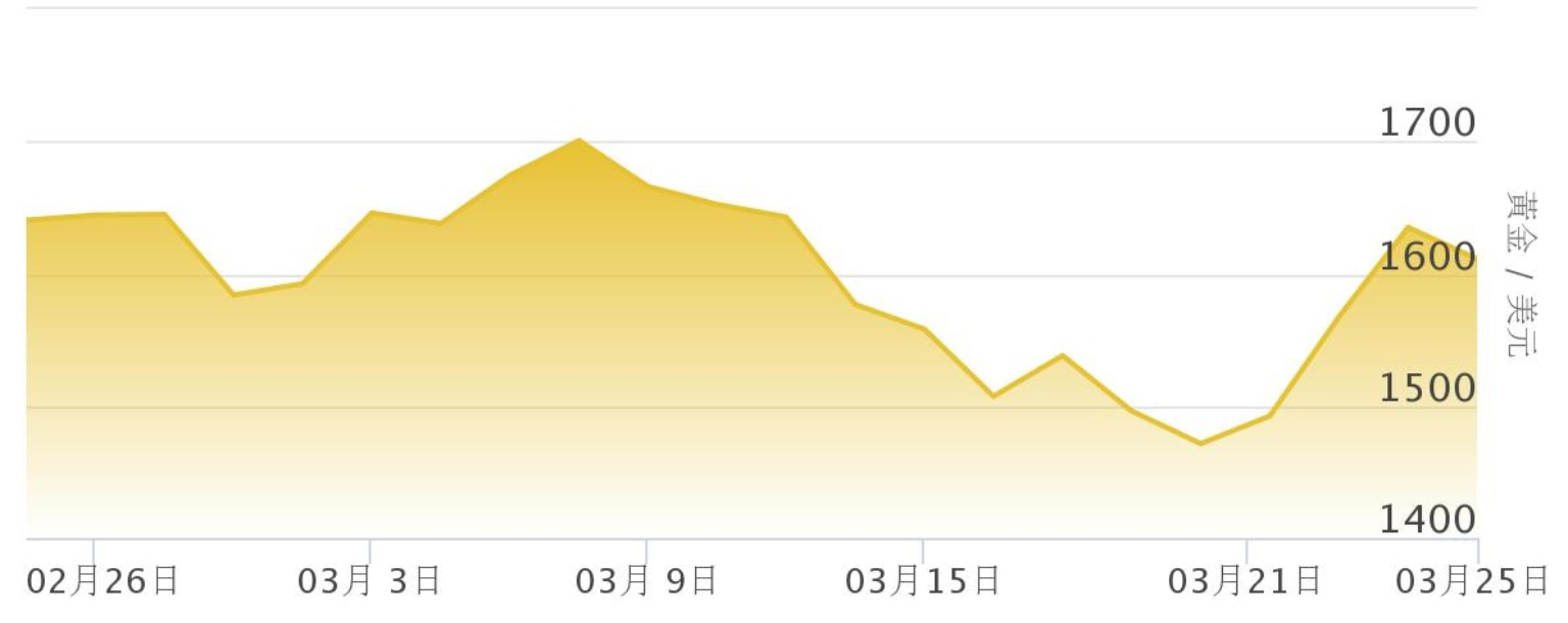 事實上,今年以來國際黃金現貨價面臨下沖下洗。觀察近一個月國際黃金現貨價走勢,受到疫情爆發、全球股市震盪,金價表現也波動劇烈,從2月底的每盎司1640美元一路漲到3月初的1700美元大關,隨後又一路下滑至3月中旬的1470元附近。近期半個月以來,黃金又再度大漲一波,26日則回到1600美元價位附近。