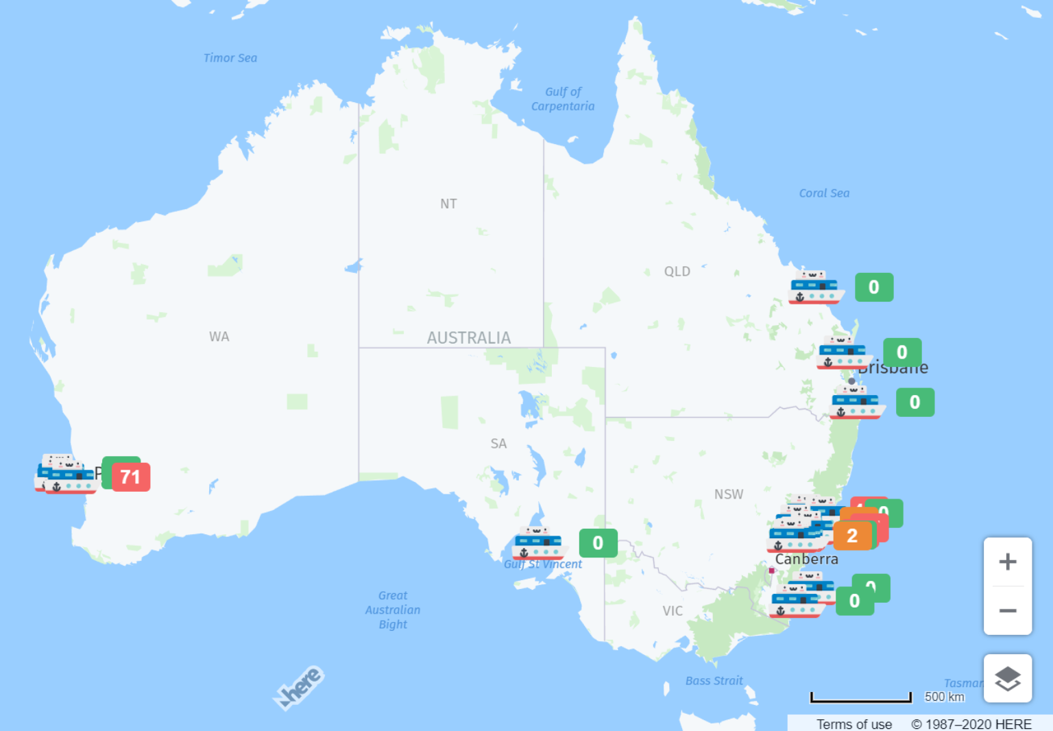 《ABC》等澳媒報導,根據「新冠病毒郵輪追蹤地圖」(COVID-19 Cruise Tracker),目前有6艘郵輪在澳洲靠港,還有13艘在其外海逗留。