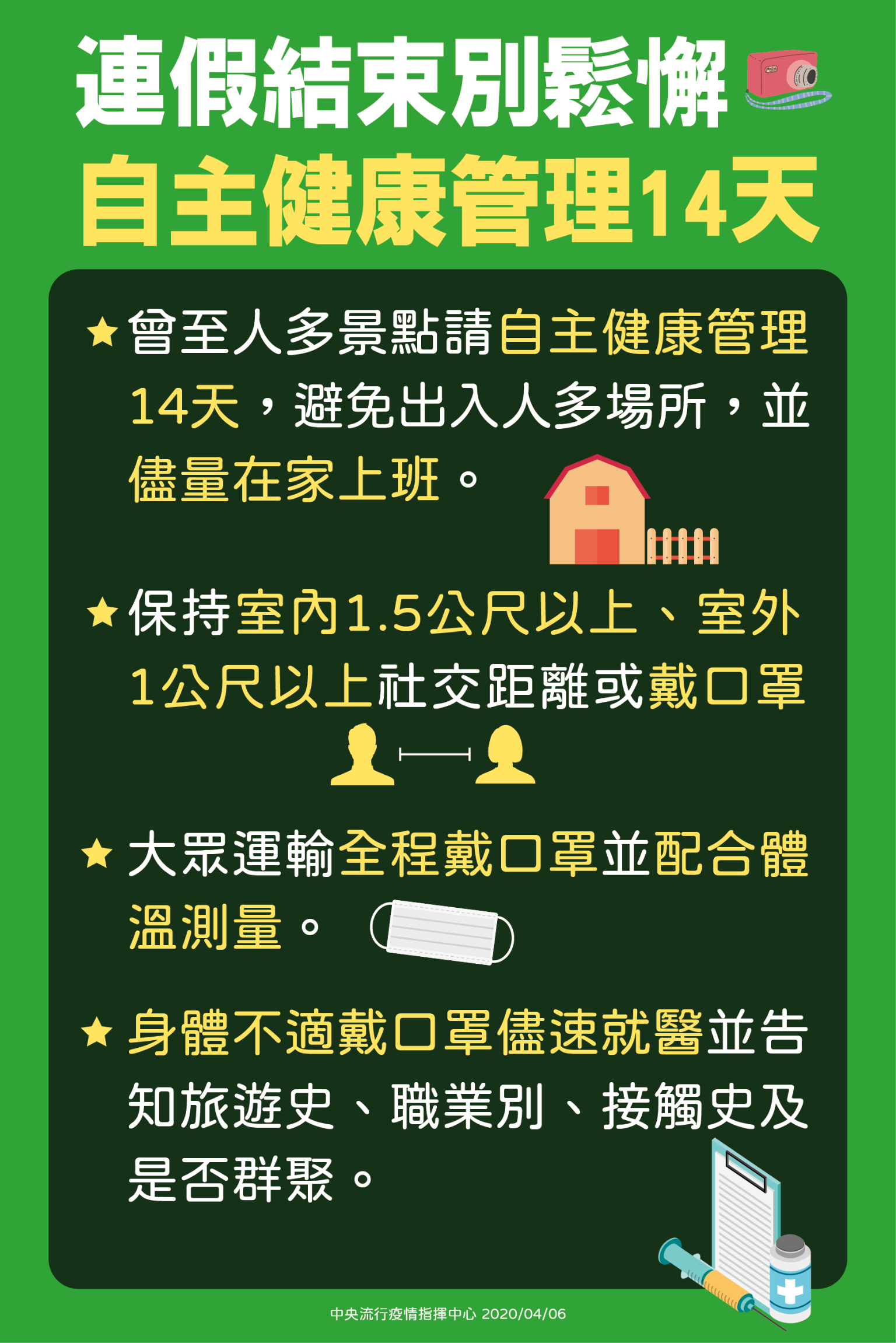 中央流行疫情指揮中心今(6)日表示,清明連假民眾南來北往互動頻繁,且部分觀光景點人潮密集,為確保國內社區防疫安全,民眾若在連假期間曾至人潮擁擠的地方活動,請自主健康管理14天,避免出入公共場所,外出時務必配戴口罩,儘可能在家上班。如有身體不適請撥打免付費防疫專線1922,就醫時務必告知旅遊史。