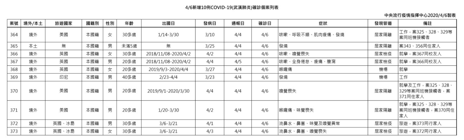 指揮中心指出,案364於美國工作,3月10日發病,3月30日入境時主動向機場申報有症狀並採檢,檢驗結果為陰性,居家檢疫期間,因所搭乘班機上有其他旅客已確診,因此改列為居家隔離之接觸者,個案因持續有不適症狀,於4月3日由衛生單位安排就醫採檢,於今日確診。