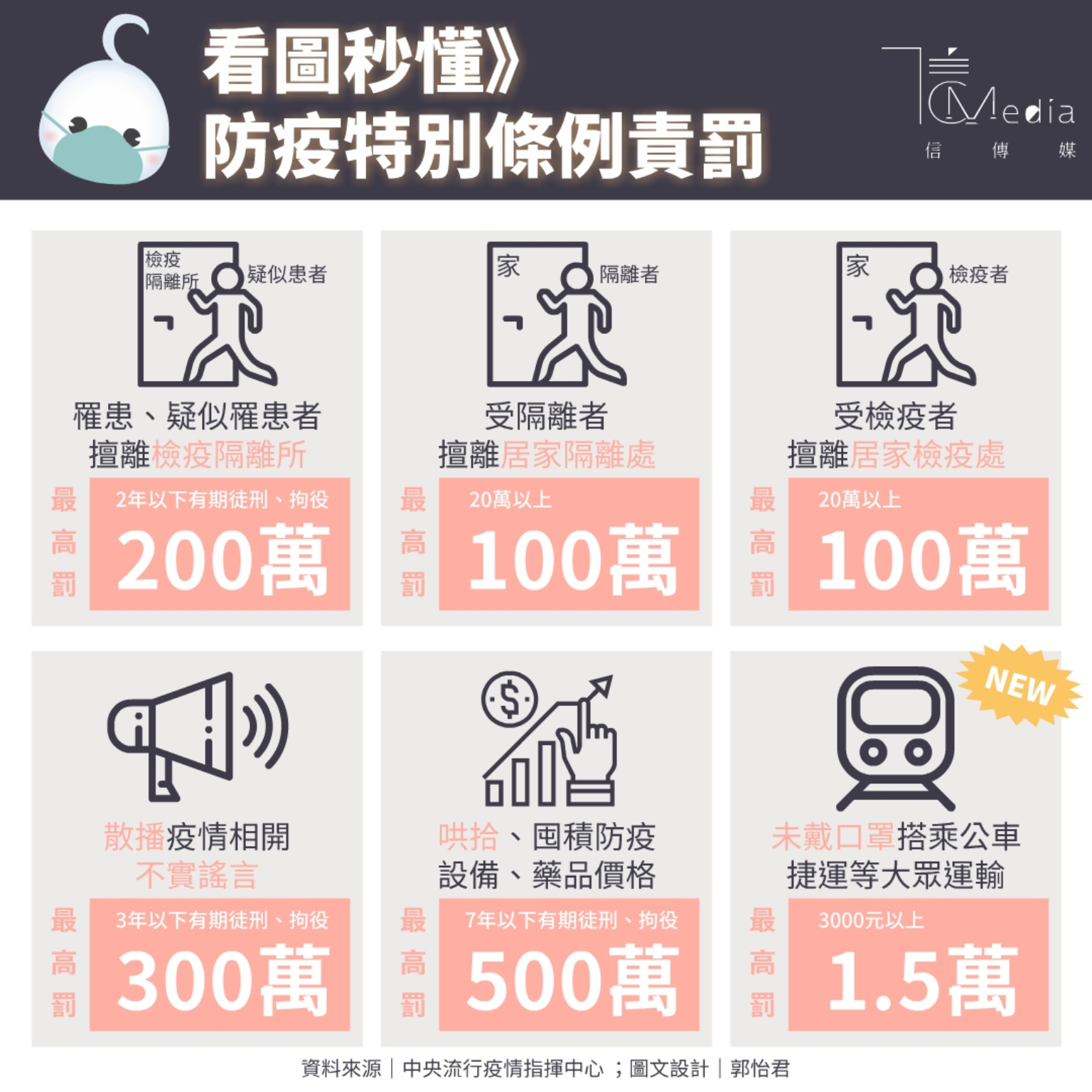 而居家隔離、居家檢疫者擅離家中趴趴走,立法院也大幅提高罰則,從30萬提升至最高罰鍰100萬;而疑似患者或確診患者擅離隔離檢疫所,最高罰鍰200萬,處以2年以下有期徒刑或拘役。