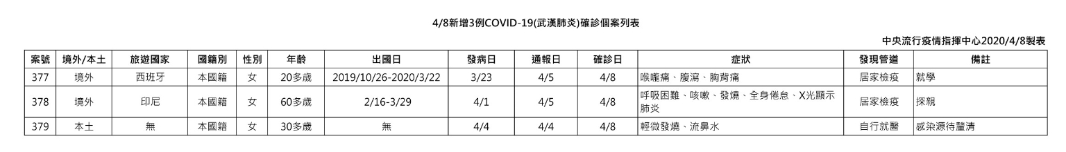 指揮中心表示,今日新增2例境外移入個案分別為20多歲女性(案377)及60多歲女性(案378)。其中案377於西班牙就學,3月22日入境後進行居家檢疫,3月23日出現喉嚨乾痛及腹瀉症狀,並自行服藥,4月4日地方政府追蹤個案健康狀況時,個案表示持續有流鼻涕及鼻塞情形,且有輕微腹瀉、胸背痛等症狀,因此由衛生單位安排就醫採檢,於今日確診。