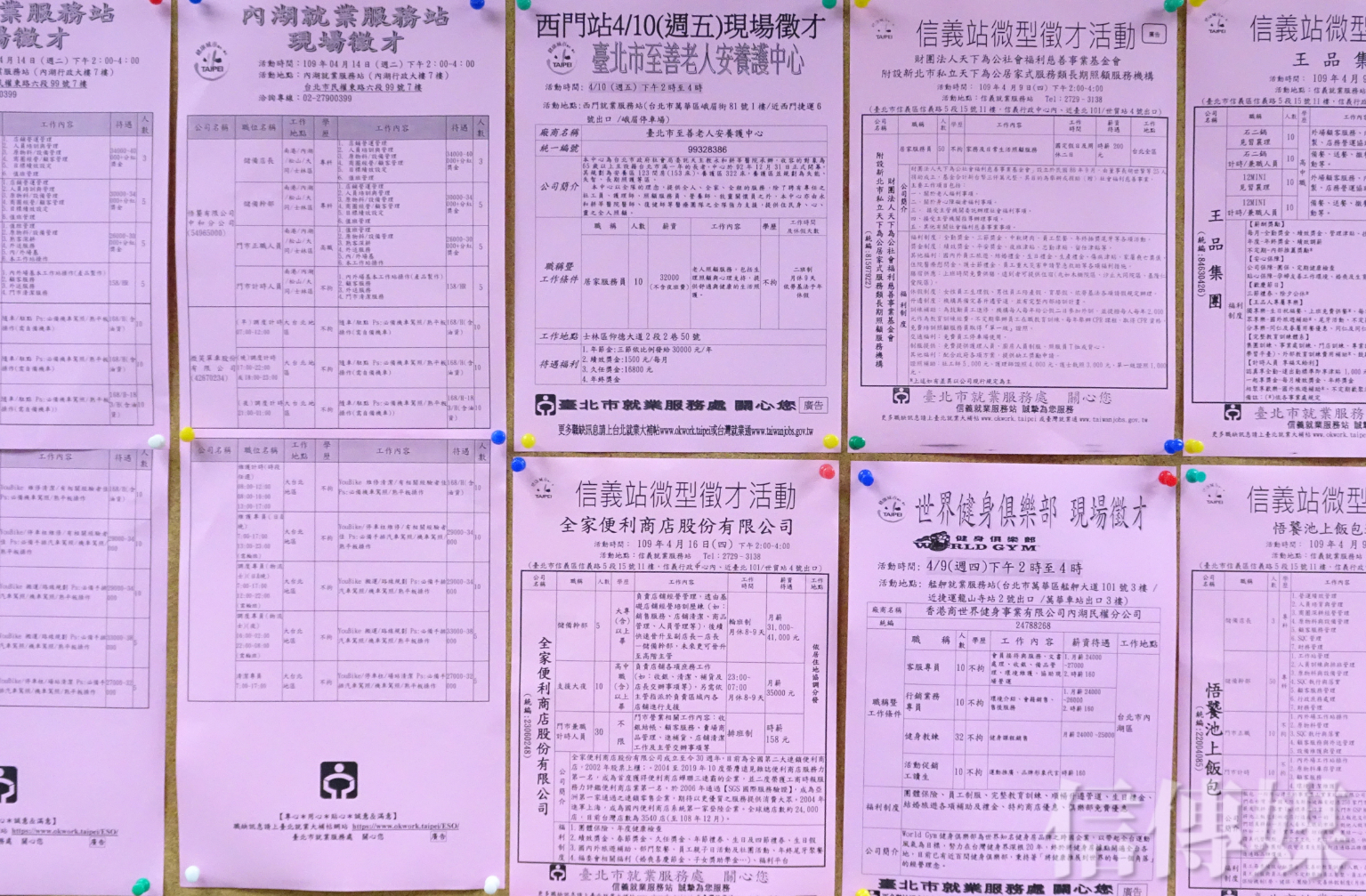 北市府推出「千人防疫就業方案」,釋出1001個職缺,並於4月6日開放申請。第三天了,8日位於西門、北市府的就業服處臨櫃仍有不少人辦理職缺諮詢服務,更有部分用人單位也安排面試,在疫情衝擊的這波失業潮,部分民眾也順利得以上工。