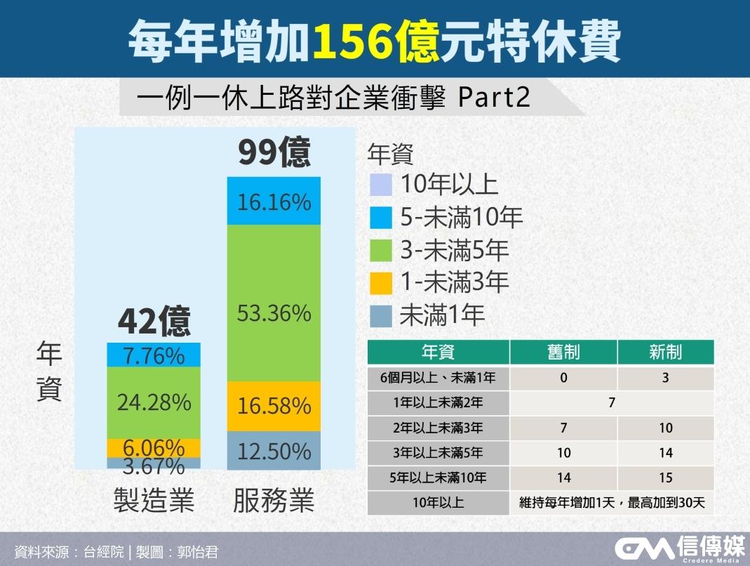台經院從新的制度以及年資結構去反推,算出單從增加的特休假來看,製造業雇主一年大約要增加42億元的成本(年資未滿5年的勞工比重24.28%),服務業由於年資未滿5年的勞工比重超過一半、高達53.36%,一年光是特休假就要增加99億元的成本,換句話說,光是特休假的增加,企業一年大約要增加156億元的成本。