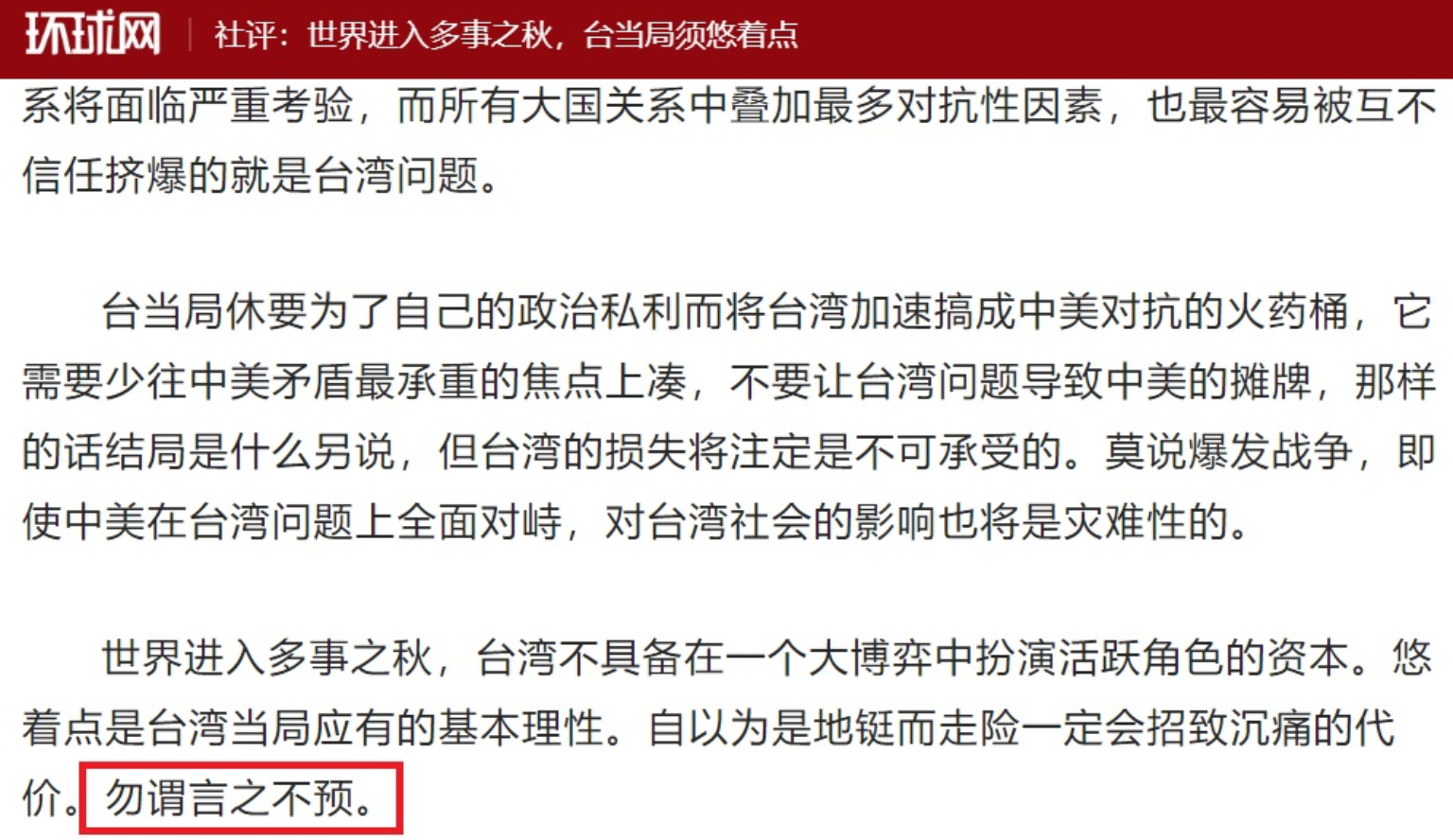 社評警告,台當局不要為了自己的政治私利而將台灣加速搞成中美對抗的火藥桶,它需要少往中美矛盾最承重的焦點上湊,不要讓台灣問題導致中美的攤牌,那樣的話結局是什麼另說,但台灣的損失將註定是不可承受的。
