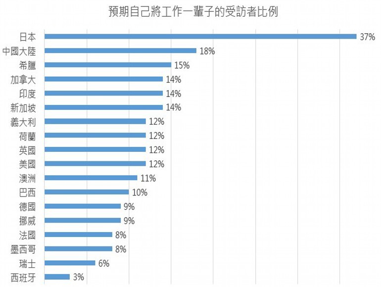 就個別國家的情況來看,此次調查仍舊反映出東方國家人民天生吃苦耐勞、任勞任怨的民族性,其中日本的年輕人有高達37%的比例已經對退休的可能性不抱任何期望,在所有國家中高居首位,而中國大陸也以18%的數字緊追在後,另外印度與新加坡則是並列在第四的位置。