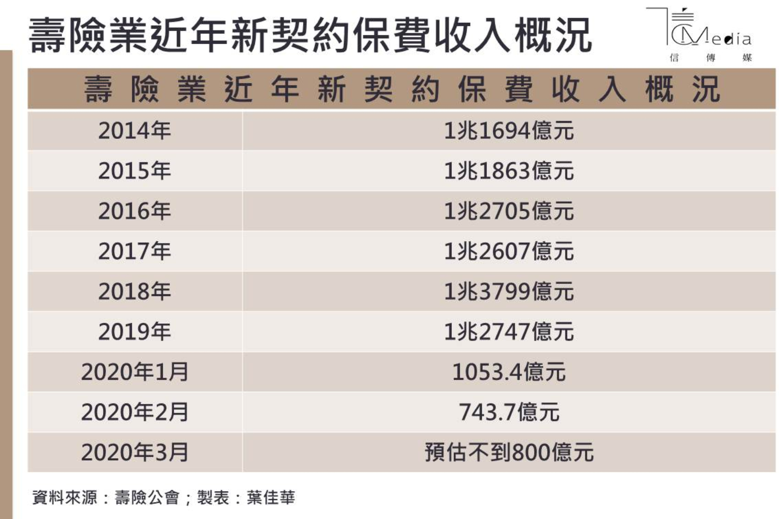 壽險業面臨保費收入懸崖越來越明顯。根據壽險公會統計,今年前2月新契約保費1797億元,比去年同期衰退超過3成,是史上罕見的衰退幅度。而今年3月更遇上疫情衝擊,3月單月整體壽險業新契約保費收入預估將達不到800億元,衰退幅度可能達到4成。