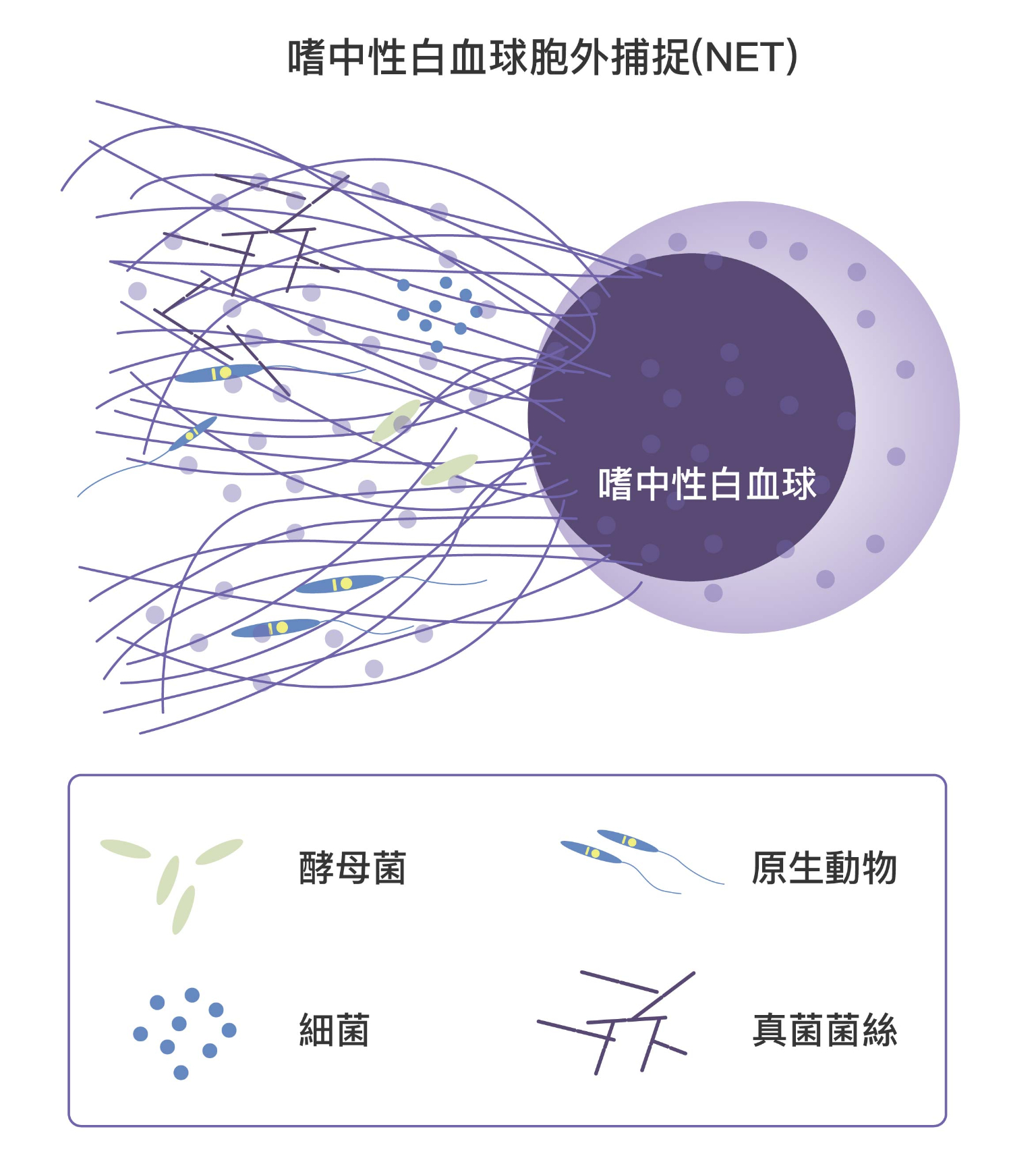 嗜中性白血球,會吞吃入侵者,如果敵人太多,甚至會「自爆」釋放出自己的網狀遺傳物質(deoxyribonucleic Acid, DNA)黏住細菌,再由附著在 DNA 的酶將其殺死、清除,這個過程稱作嗜中性白血球胞外捕捉 (neutrophil extracellular traps, NETs)。